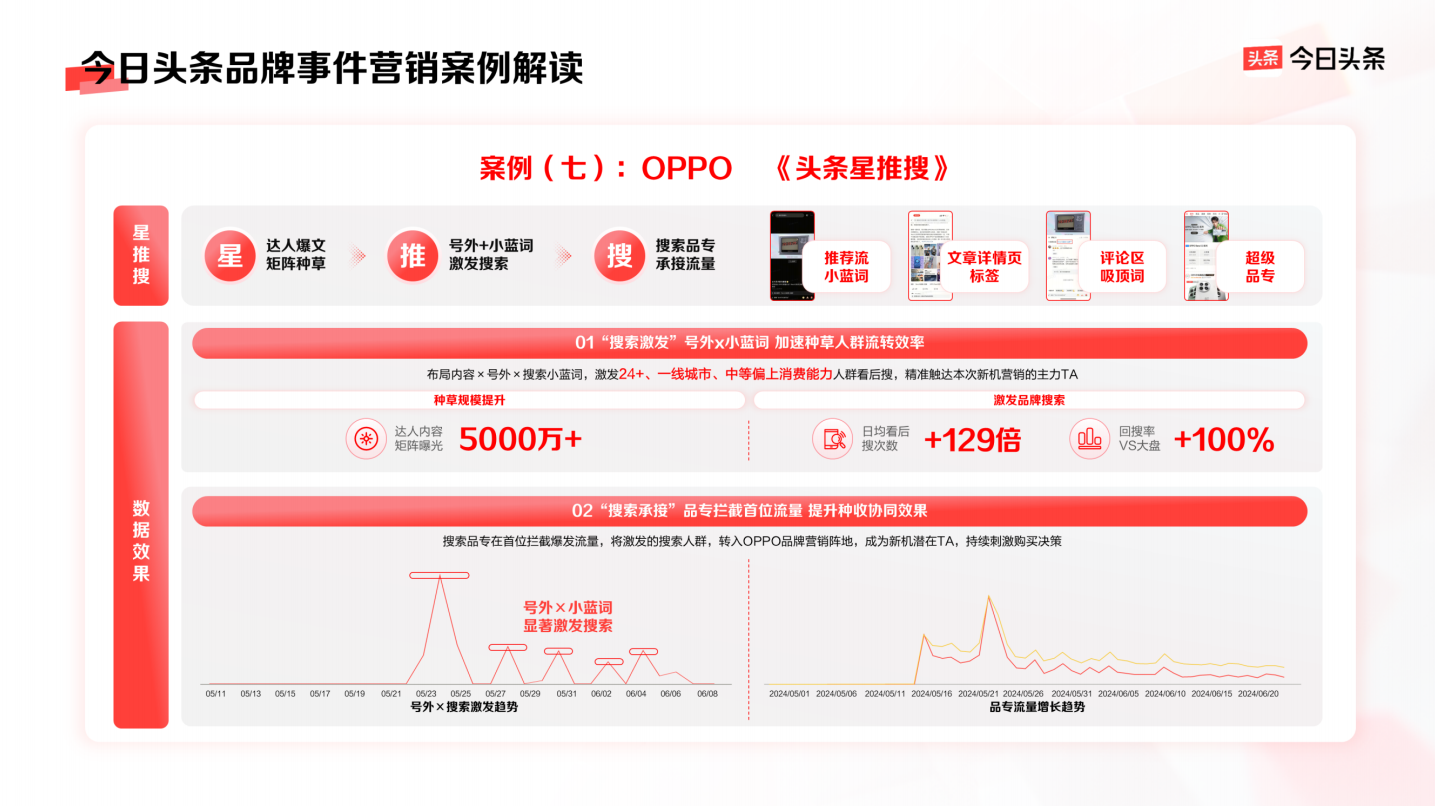 如OPPO新機(jī)上線。今日頭條配合品牌布局頭條星推搜,針對(duì)性觸達(dá)24+、一線城市、中等偏上消費(fèi)能力人群,激發(fā)其看后搜動(dòng)作。通過(guò)達(dá)人爆文矩陣種草、號(hào)外+小藍(lán)詞激發(fā)搜索、搜索品專承接流量,層層遞進(jìn),協(xié)助OPPO新機(jī)獲得5000萬(wàn)+曝光,激發(fā)日均看后搜次數(shù)增長(zhǎng)129倍、回搜率對(duì)比大盤(pán)增加100%。今日頭條幫助品牌在新品上市期精準(zhǔn)觸達(dá)高潛用戶人群,搶占先機(jī)。