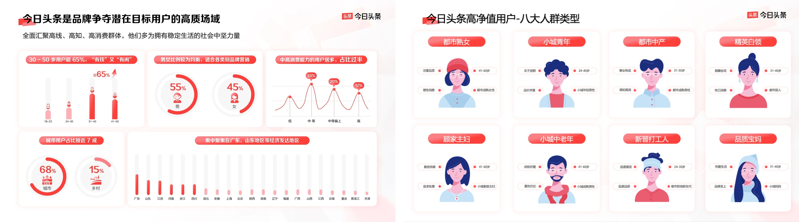 高凈值人群聚集只是一個(gè)基礎(chǔ),對(duì)品牌營(yíng)銷而言,更重要的是如何將平臺(tái)人群為我所用,將平臺(tái)高凈值人群轉(zhuǎn)化為品牌消費(fèi)者。 從《通案》中可以看到,今日頭條的高凈值人群活躍度更高、觸點(diǎn)更豐富,且平臺(tái)針對(duì)都市中產(chǎn)、新晉打工人、小城青年、小城中老年、精英白領(lǐng)、品質(zhì)寶媽、都市熟女、顧家主婦八大人群類型,及其消費(fèi)特征、內(nèi)容關(guān)注,都有系統(tǒng)歸納,方便品牌精準(zhǔn)觸達(dá)。