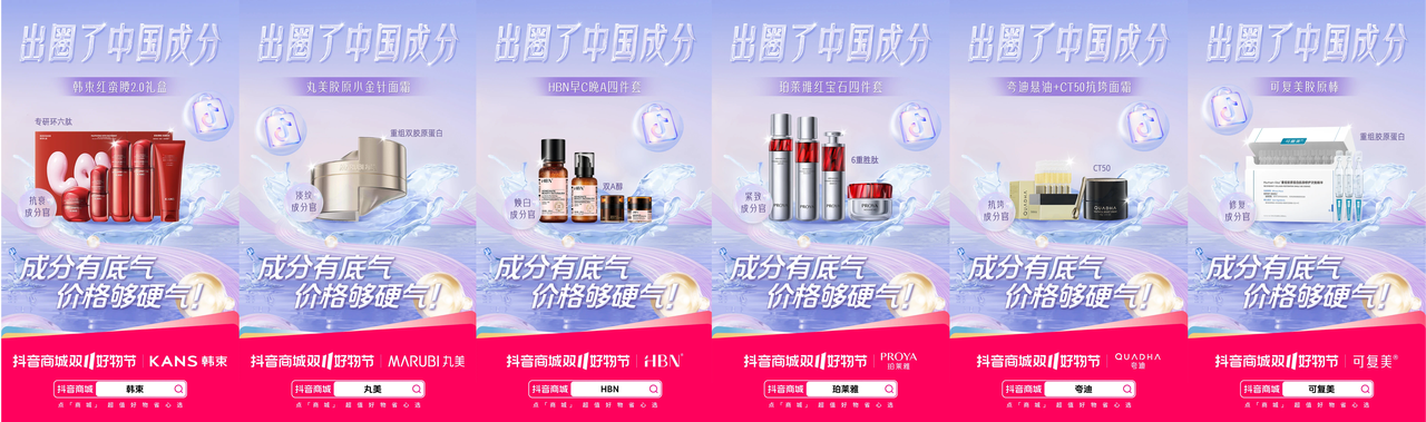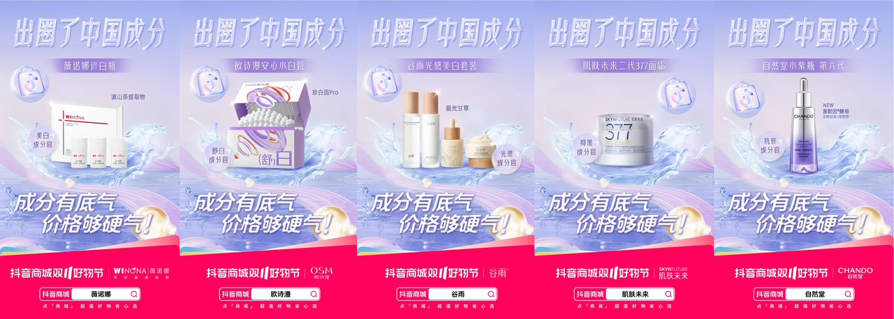 本次「出圈了中國成分」主題傳播活動中,抖音電商平臺深挖珀萊雅、薇諾娜、韓束等眾多護膚品牌成分,聚焦于成分這一核心優(yōu)勢,幫助在美白、抗老、修護三大細(xì)分賽道持續(xù)領(lǐng)跑的國貨品牌們充分展示王牌成分。