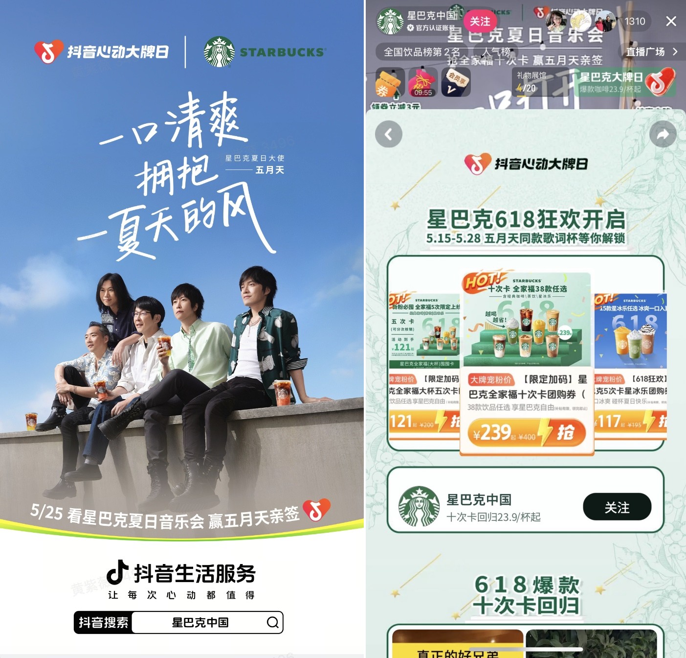 作為全球咖啡行業(yè)代表,星巴克在中國(guó)坐擁超7000家門店,品牌自創(chuàng)立以來(lái),一直致力于為用戶打造高品質(zhì)咖啡的社交聚集地。今年五月,品牌精準(zhǔn)把握“五月天25周年”這一集體情懷爆發(fā)點(diǎn),借勢(shì)「抖音心動(dòng)大牌日」IP勢(shì)能開啟特別企劃:以“咖啡+音樂”雙載體重構(gòu)消費(fèi)場(chǎng)景,將門店轉(zhuǎn)化為粉絲的青春記憶場(chǎng)域,更借抖音全域流量為“五迷”釋放獨(dú)家夏日驚喜。