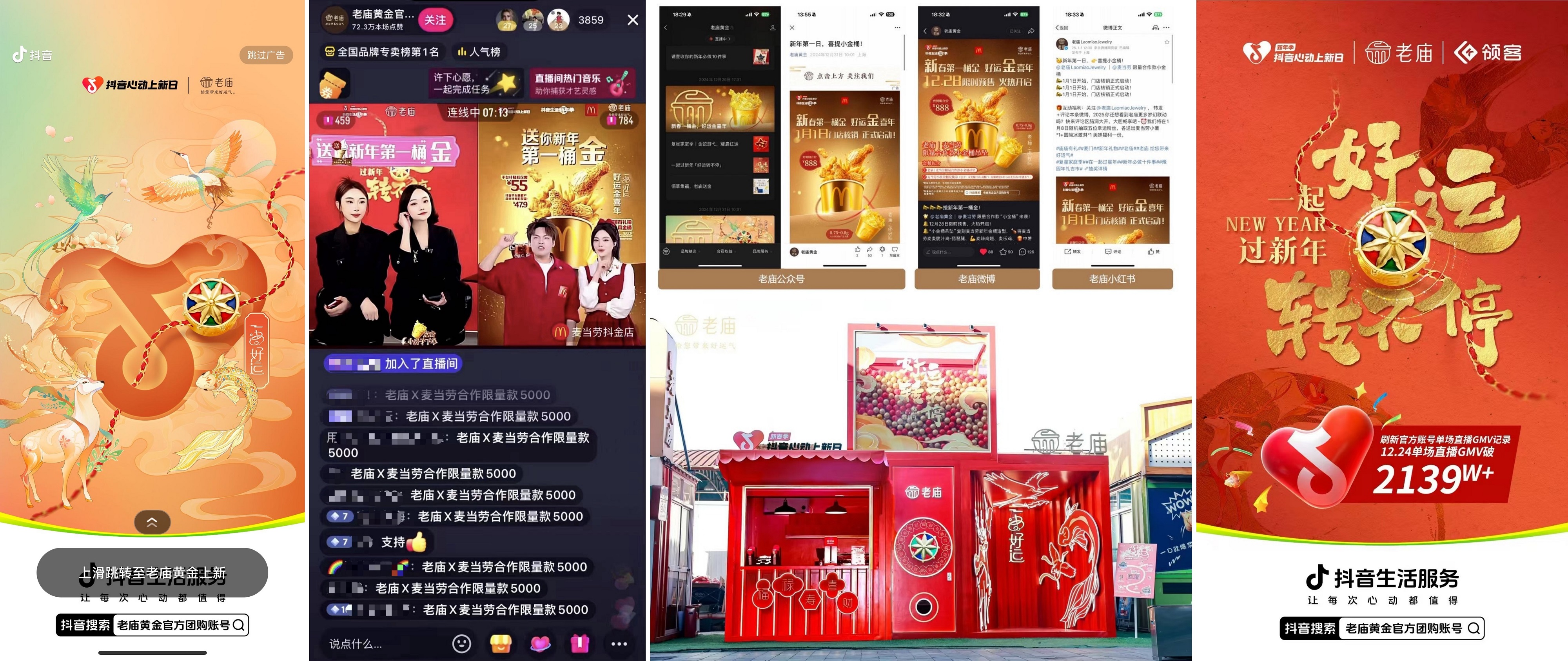 活動(dòng)期間,老廟黃金在官方賬號(hào)同步啟動(dòng)多輪直播,為大家詳細(xì)解讀新品信息,并發(fā)放大額優(yōu)惠券,讓消費(fèi)者享受“買(mǎi)金即享立減”的切實(shí)優(yōu)惠,圣誕專場(chǎng)更是打破了黃金珠寶行業(yè)官號(hào)直播單日歷史峰值,成功刷新行業(yè)記錄;12月28日,老廟黃金還在直播間驚喜“連麥”麥當(dāng)勞為廣大粉絲派發(fā)驚喜福袋,輔以各類趣味互動(dòng)環(huán)節(jié),不斷將直播間喜慶氛圍推至高潮。除此之外,品牌與平臺(tái)聯(lián)合打造的#新年第一桶金 熱點(diǎn)話題也在站內(nèi)持續(xù)升溫,位于海豫園的線下快閃活動(dòng)更吸引大批用戶前往打卡……一系列舉措共同助推品牌打爆新品,收獲銷售佳績(jī)。