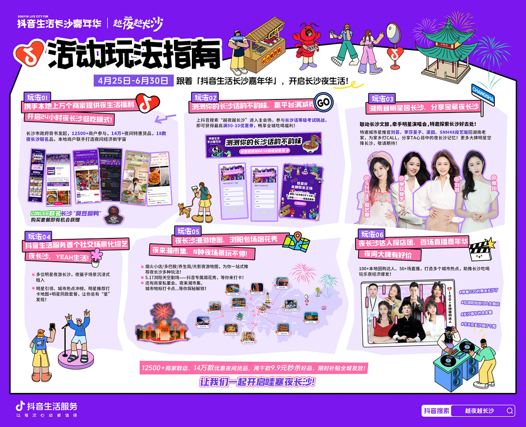 4月25日至6月30日,「抖音生活長沙嘉年華-越夜越長沙」IP活動正在點(diǎn)燃長沙夜晚!這個春夏,抖音生活服務(wù)圍繞長沙獨(dú)有的文化特色,整合明星陣容、聯(lián)動政府文旅資源,在湘江兩岸鋪開一幅“食、游、購、娛”全景夜生活圖鑒,同步聯(lián)動多領(lǐng)域商家探索消費(fèi)新場景,實現(xiàn)交易增長。