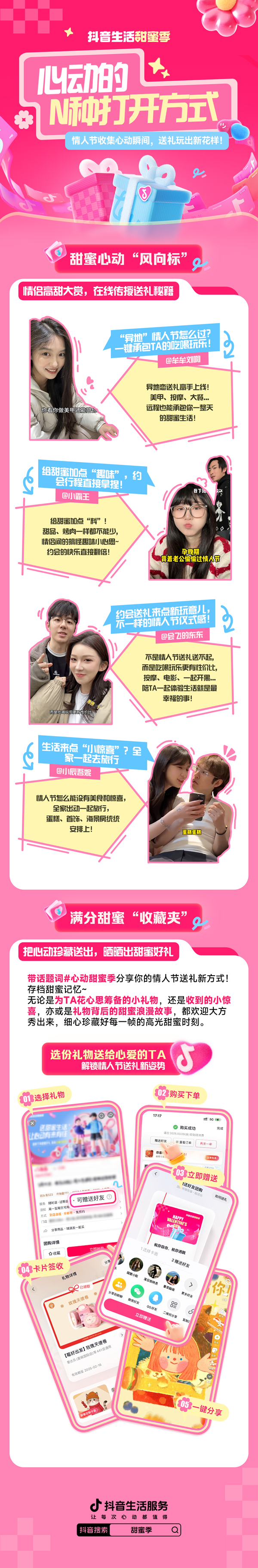 2·14不只是情人節(jié),更是表達(dá)愛意的好時機(jī)!送禮不如送體驗(yàn)。這個情人節(jié),抖音生活服務(wù)推出「甜蜜季」特別活動,全網(wǎng)尋找“最會送禮”的你!無論是一起逛商場、做情侶手工,還是一起去旅行,和TA在一起的每一刻,都是值得珍藏的記憶。