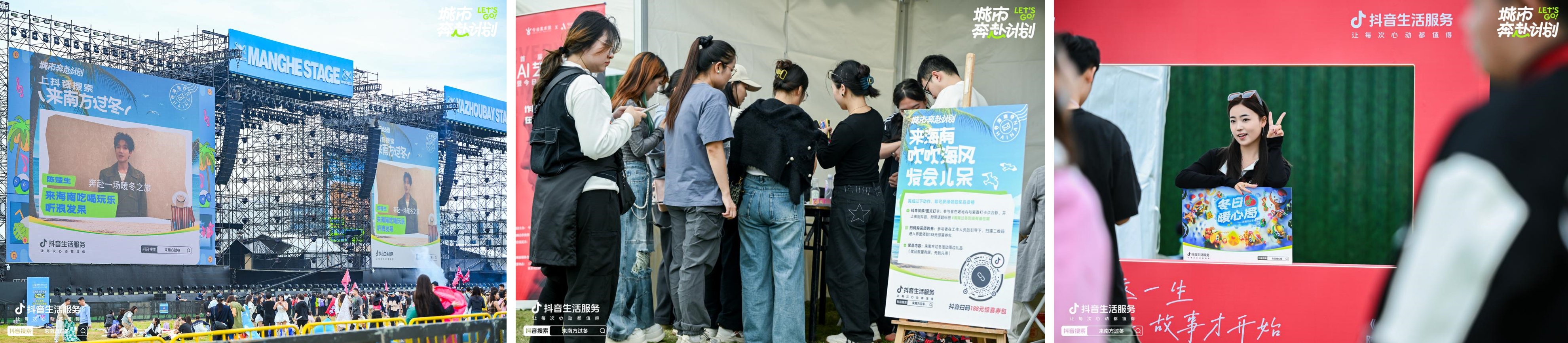 活動期間,抖音生活服務利用IP場景化營銷為活動造勢,現(xiàn)場聯(lián)合雪王與加菲貓夢幻聯(lián)動打卡裝置,游客們在打卡點光速出片,自在隨心地在海南過冬,get滿分松弛感。