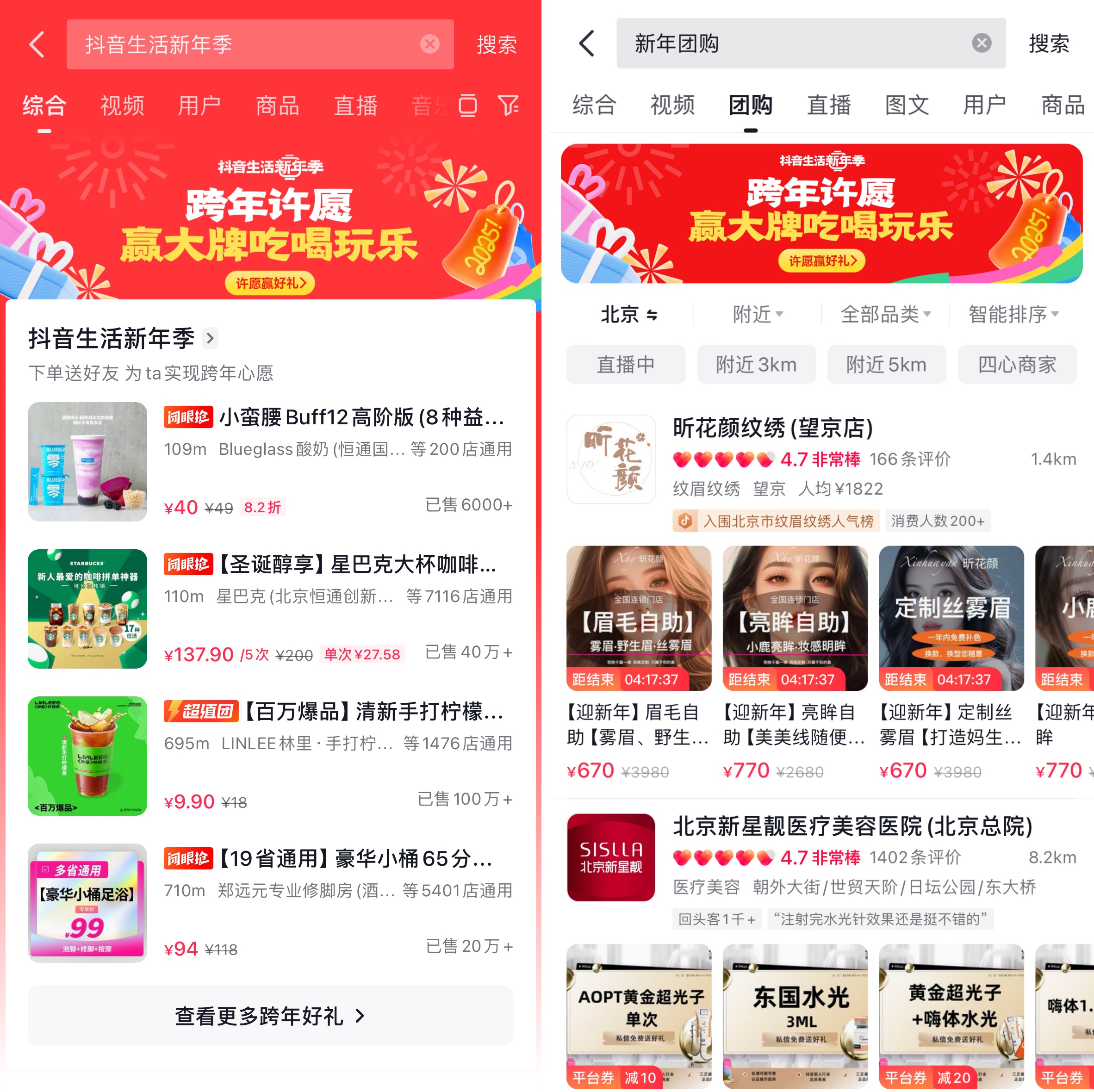在 2024年即將收官之際,抖音生活服務(wù)攜手吃喝玩樂(lè)全品類(lèi)大牌商家于2024年12月20日發(fā)起「抖音生活新年季」活動(dòng)。以"上抖音,花小錢(qián),過(guò)大年"為主題,匯聚各個(gè)大牌商家為用戶(hù)獻(xiàn)上一場(chǎng)誠(chéng)意滿(mǎn)滿(mǎn)新年狂歡盛宴。