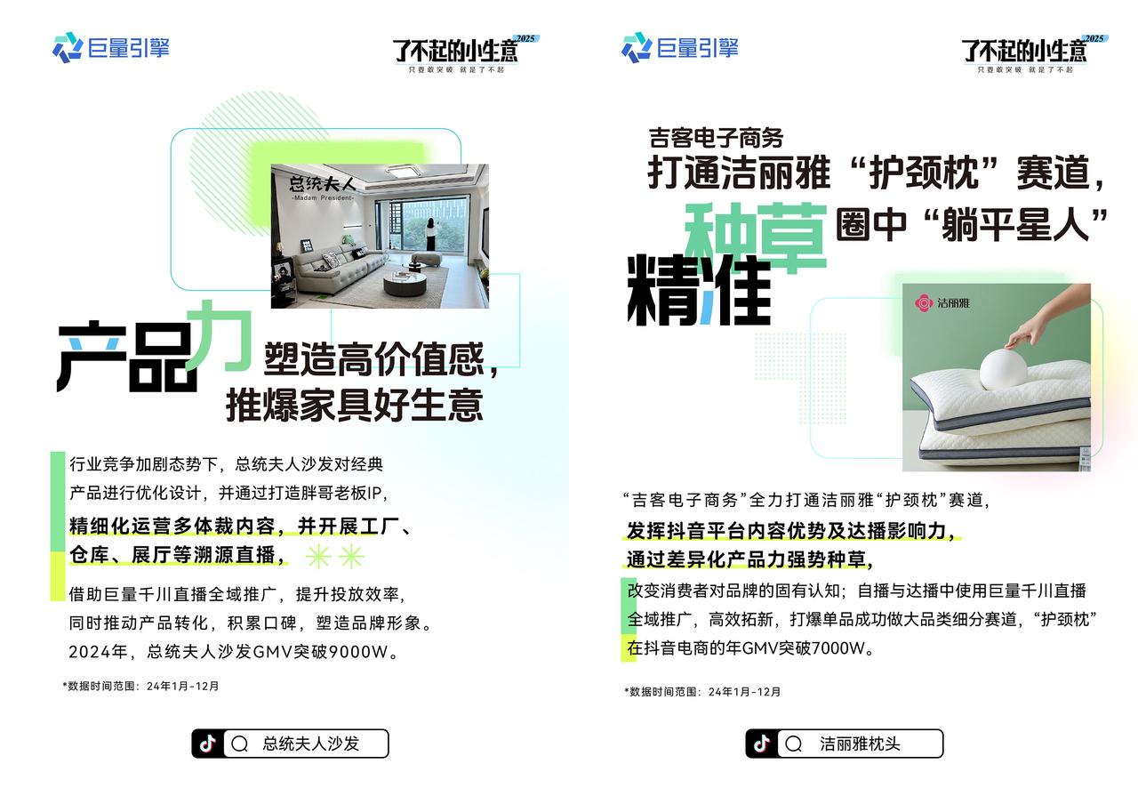 2024年,抖音成長型家居商家GMV年增長 22.7%,對于家居行業(yè)的耐消品而言,驅(qū)動生意的核心在于通過強產(chǎn)品力來塑造高價值感的品牌形象,@總統(tǒng)夫人沙發(fā)通過打造IP、優(yōu)化產(chǎn)品設計、溯源直播等完成品牌形象的塑造,精準定位高價值人群,加速產(chǎn)品購買;對于家居中的快消品而言,則需要通過差異化的強產(chǎn)品力來贏得市場,@吉客電子商務全力打通潔麗雅”護頸枕“賽道,通過精準洞察需求打造差異化產(chǎn)品,以優(yōu)質(zhì)內(nèi)容及達播影響力,強化差異化賣點,快速種草打爆,拉動新客帶來首購轉(zhuǎn)化。