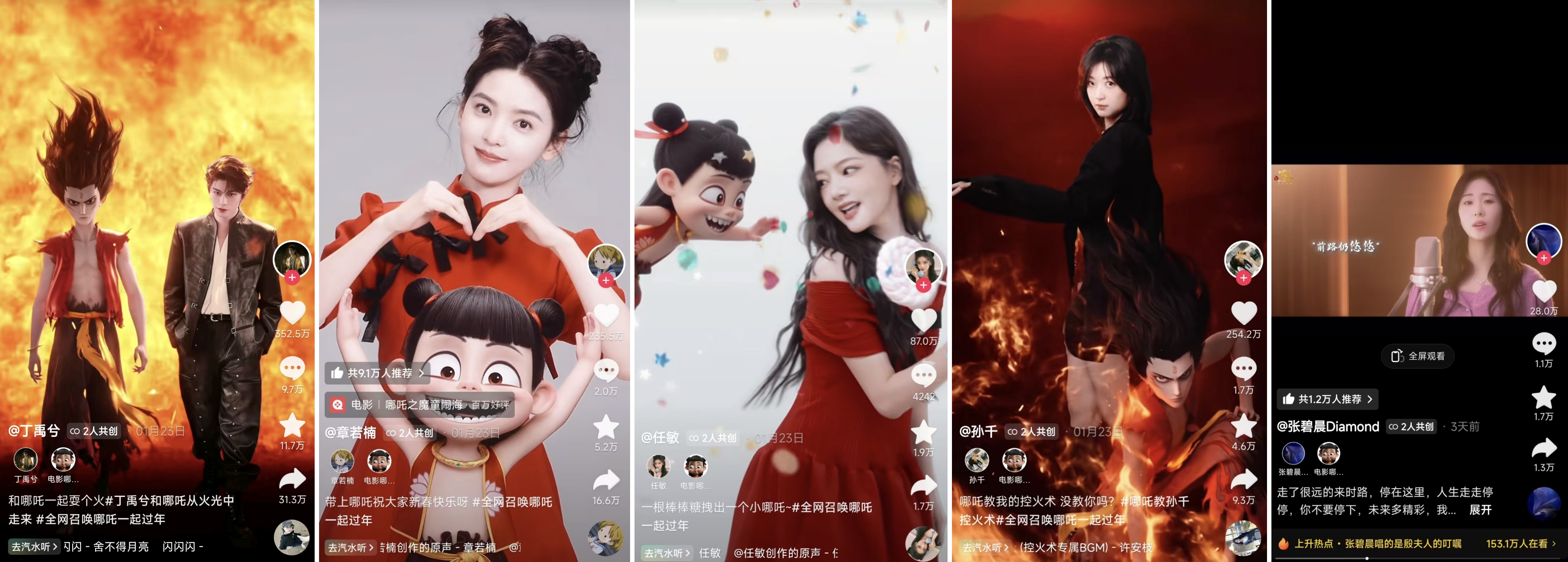抖音更邀請丁禹兮、章若楠、任敏、孫千、張碧晨等藝人,與哪吒共創(chuàng)情景短視頻,或帥氣酷颯,或可愛溫馨,吸引了大量網(wǎng)友的點贊與分享,進一步助推《哪吒之魔童鬧?!窡岫?ldquo;出圈”。