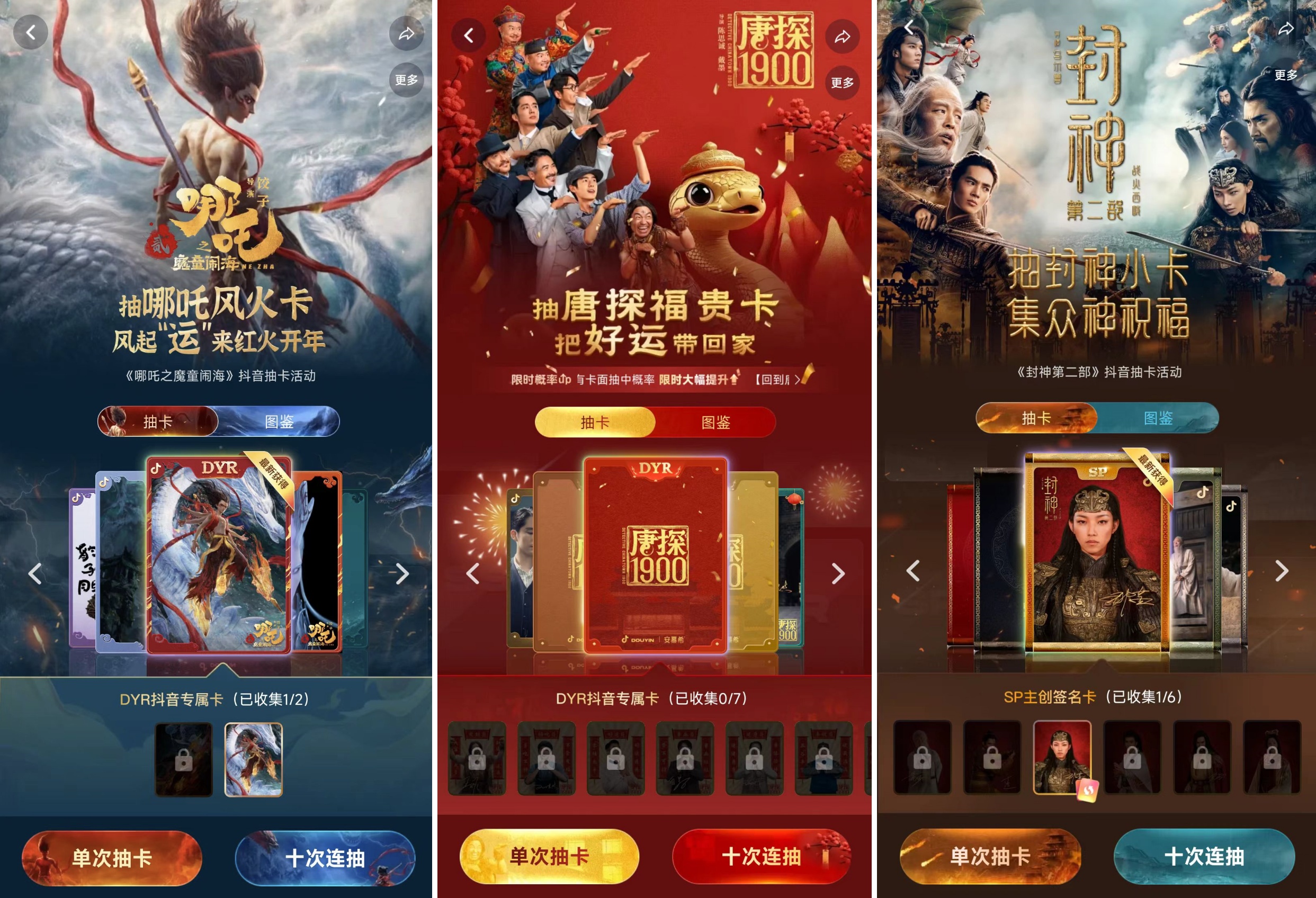 活動期間,抖音聯(lián)合《哪吒之魔童鬧?!贰短铺?900》《封神第二部:戰(zhàn)火西岐》三部電影推出抽卡活動,精美的卡面吸引了大量用戶的參與。其中,超240萬人參與到《哪吒之魔童鬧?!返某榭ɑ顒又校瑤庸偬枬q粉166萬+,形成觀影后的二次傳播熱潮。