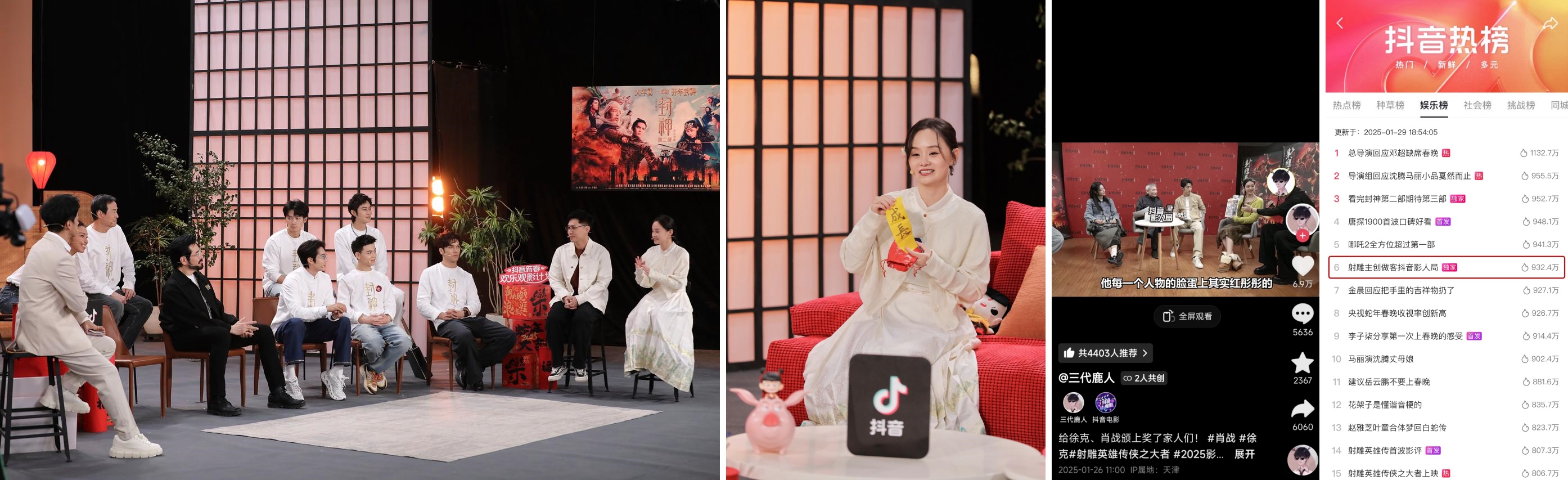 除此之外,抖音電影百評團成員更作為大家的“嘴替”,對電影主創(chuàng)進行了專訪。@婧公子 、@硬核卡子 與《哪吒之魔童鬧海》、《封神第二部:戰(zhàn)火西岐》主創(chuàng)在直播中展開深度互動,探究電影背后的創(chuàng)作故事;@三代鹿人 在與《射雕英雄傳:俠之大者》的主創(chuàng)對談中,向主演展示了抖音網(wǎng)友創(chuàng)作的海報,讓影迷們的心意得以傳達,而#射雕主創(chuàng)做客抖音影人局 也登上了抖音娛樂榜TOP6,進一步推動電影熱度的增長。