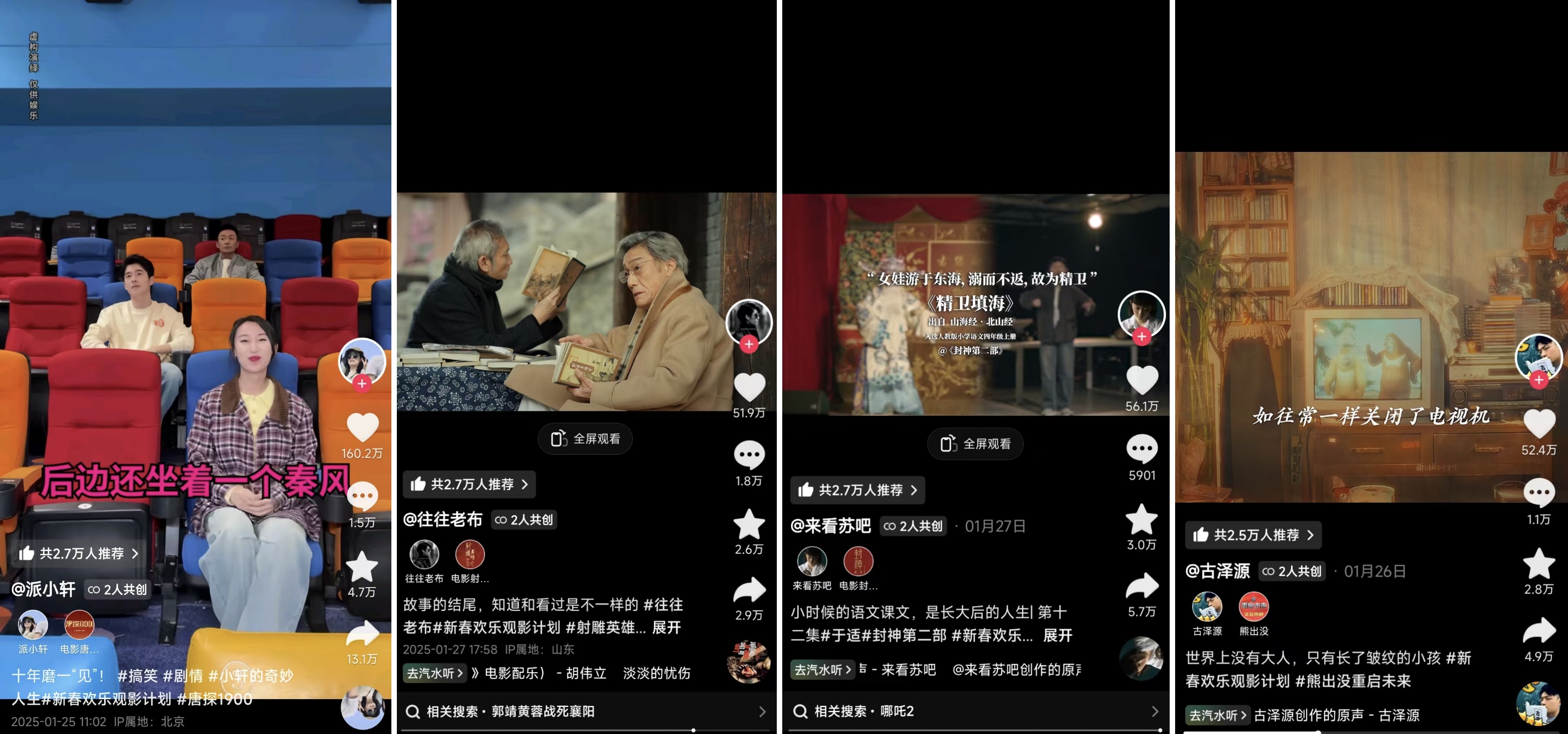 這些共創(chuàng)短片將電影IP融入生活場景,用幽默、情懷與溫情等情緒打動用戶,收獲總播放量超2.4億,點贊量1145萬+,單條視頻點贊量均超過了50萬(數(shù)據(jù)截止2月5日)詮釋了“一部電影,千萬種打開方式”。不僅將電影內(nèi)核與觀眾情緒緊密連接,更帶動用戶二創(chuàng),反哺影片熱度,形成“用戶種草——觀影——二次創(chuàng)作”的正向循環(huán)。在抖音,電影從不散場,每個人都是續(xù)寫故事的導演。