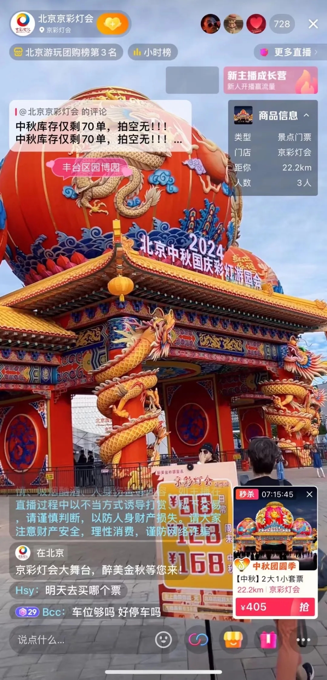 為了提升官方賬號售賣權(quán)重,商家官號配合節(jié)點脈沖提前一天開播,為這場傳統(tǒng)文化與現(xiàn)代文藝相碰撞的盛會預(yù)熱。針對不同時段的平臺流量和用戶需求,在抖音「中秋團(tuán)圓季」活動期間,京彩燈會連續(xù)7天上午進(jìn)行官號切片直播,在流量高峰期的下午和晚上進(jìn)行現(xiàn)場直播,以有序有節(jié)奏的傳播玩法承接抖音帶來的流量熱度,為品牌在多階段持續(xù)引流。
