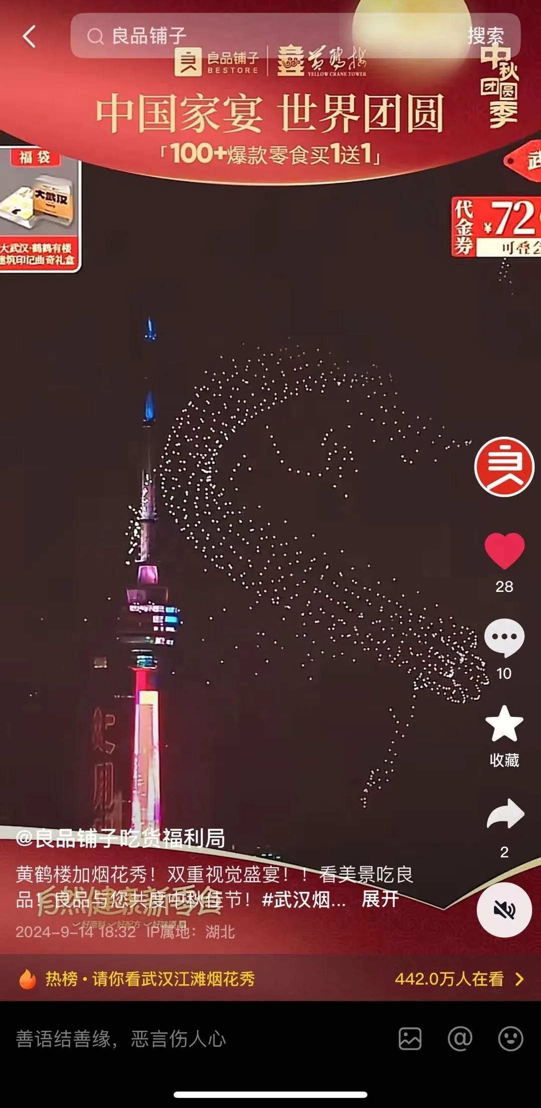 作為主張“自然健康新零食”理念的品牌,良品鋪子向來注重消費者的感官體驗。剛迎來“成人禮”的良品鋪子,在抖音「中秋團(tuán)圓季」活動中,將“邊看邊買”升級為“邊看邊買邊體驗”。不同于傳統(tǒng)直播方式,良品鋪子選擇攜手黃鶴樓進(jìn)行聯(lián)名直播,把中秋家宴搬到有著1800年歷史的黃鶴樓,款待18位來自全球的會員摯友,打造獨一無二的團(tuán)圓記憶,加深了與消費者的情感溝通。整場實景直播視覺呈現(xiàn)較強,達(dá)播氛圍濃烈,從而提升整體轉(zhuǎn)化。