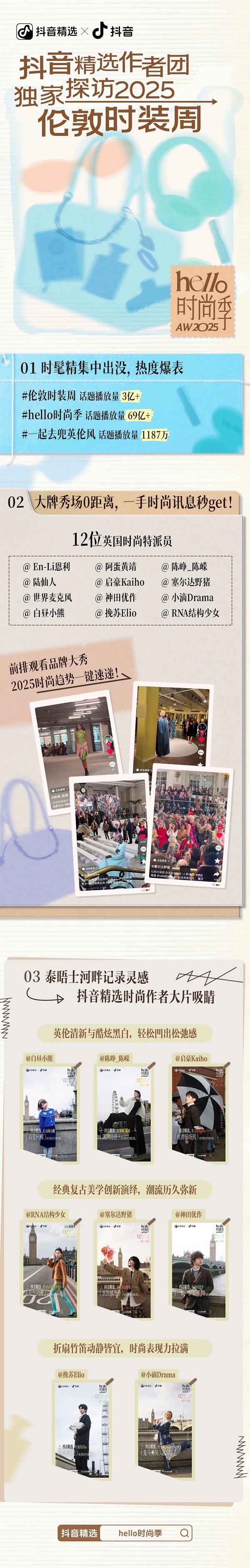 轉眼之間,2025秋冬倫敦時裝周如期落下帷幕。從秀場到街頭,從品牌創(chuàng)意理念到經(jīng)典英倫思潮,化身英國時尚特派員的12位抖音精選創(chuàng)作者們,在這場時尚盛宴中收獲了難忘的記憶與全新靈感啟發(fā)。