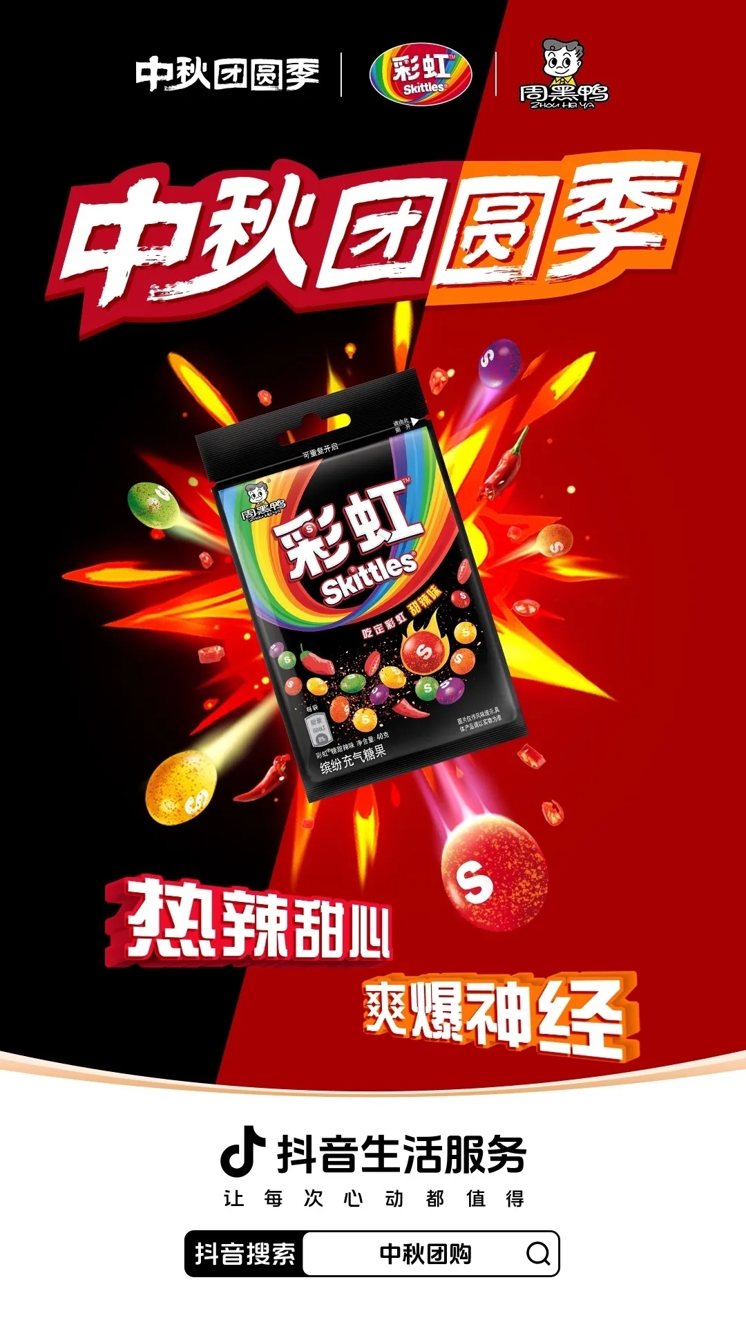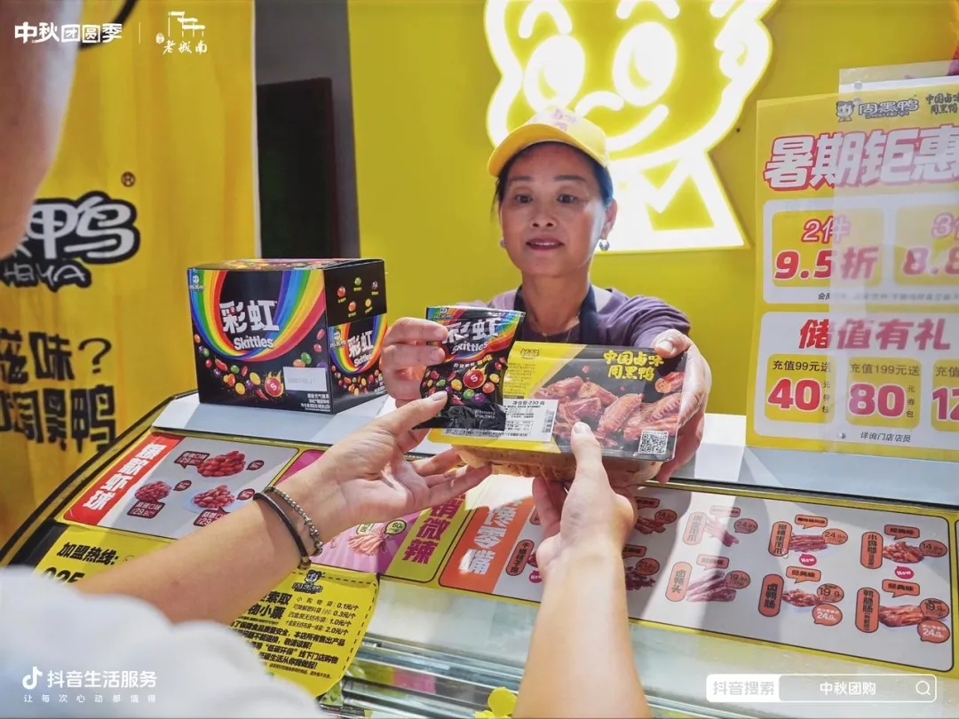 這次,在抖音生活服務「中秋團圓季」,彩虹糖與周黑鴨組成CP,推出“熱辣甜心,爽爆神經(jīng)”的組合新品,帶來甜辣兼?zhèn)涞莫毺匚独儆洃?。乘勢中秋大促,?lián)名套餐上架至活動的團購頁面,在平臺公共流量的助力下,用戶在購買中秋應季貨品的同時,也被這款玩趣“食”足的跨界新品吸引,“邊看邊買”自然帶動彩虹糖和周黑鴨的雙贏轉化成績,達成“1+1>2”的種草效果。