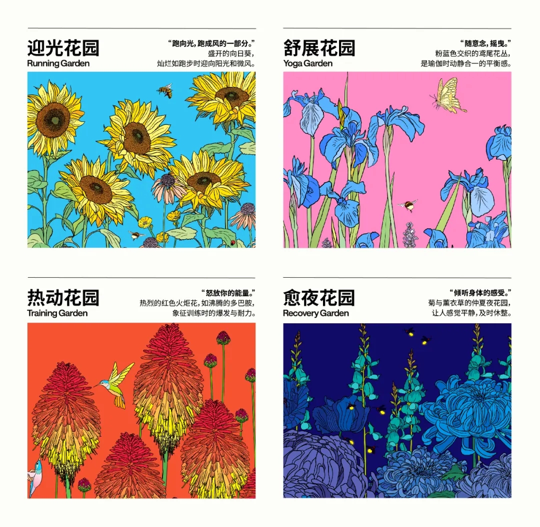 伴隨著報(bào)告的發(fā)布, lululemon正式開啟今年的“一起好狀態(tài)”主題活動(dòng),率先吸引眾人目光的是與Graphic Rewilding共同呈現(xiàn)的“好狀態(tài)心展花園”。憑借其鮮明的色彩和豐富的寓意(不同的花卉分別代表瑜伽、跑步、訓(xùn)練和恢復(fù)),該藝術(shù)作品旨在邀請(qǐng)生活在都市中的人們動(dòng)一動(dòng),讓身心松動(dòng),感受自己內(nèi)心的花園。