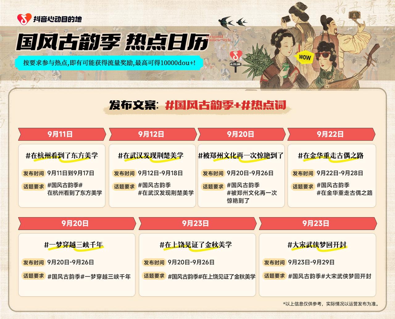 在「心動(dòng)目的地·國(guó)風(fēng)古韻季」中,七大城市熱點(diǎn)活動(dòng)將輪番上陣,以其各自獨(dú)特的文化主題點(diǎn)燃城市的文化熱情,活動(dòng)將逐步點(diǎn)亮杭州的東方美學(xué)、武漢的荊楚美學(xué)、鄭州的中原文化、金華的古偶之路、宜昌的千年三峽、上饒的金秋美學(xué)以及開(kāi)封的大宋武俠美學(xué),讓每個(gè)角落都充滿(mǎn)國(guó)風(fēng)的魅力。多城“整活兒”,讓「熱點(diǎn)」帶動(dòng)高交易,讓「交易」助力好生意。跟著熱點(diǎn)節(jié)奏,深入體驗(yàn)各地的國(guó)風(fēng)文化,還有機(jī)會(huì)獲得豐厚的流量獎(jiǎng)勵(lì),最高可達(dá)10000dou+。如果你是抖音創(chuàng)作者,與抖音生活服務(wù)一起,領(lǐng)略這一城一特色,探索城市東方美學(xué),捕捉這些城市的國(guó)風(fēng)之美吧!