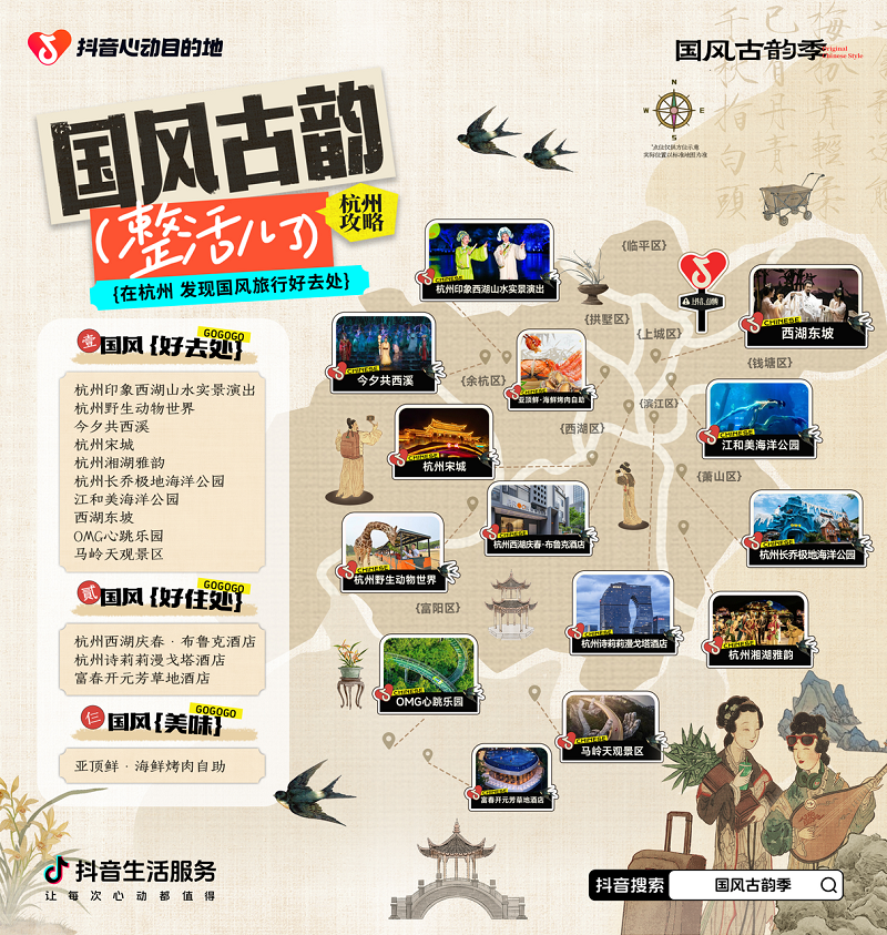 此外,為構(gòu)建全新“國(guó)風(fēng)”玩法,「心動(dòng)目的地·國(guó)風(fēng)古韻季」精心發(fā)布專(zhuān)屬?lài)?guó)風(fēng)城市漫游地圖,跟隨抖音品味7城古韻。在這份地圖的指引下,游客將深入探尋這些城市的獨(dú)特“新”韻味,領(lǐng)略它們的國(guó)風(fēng)古韻之美。