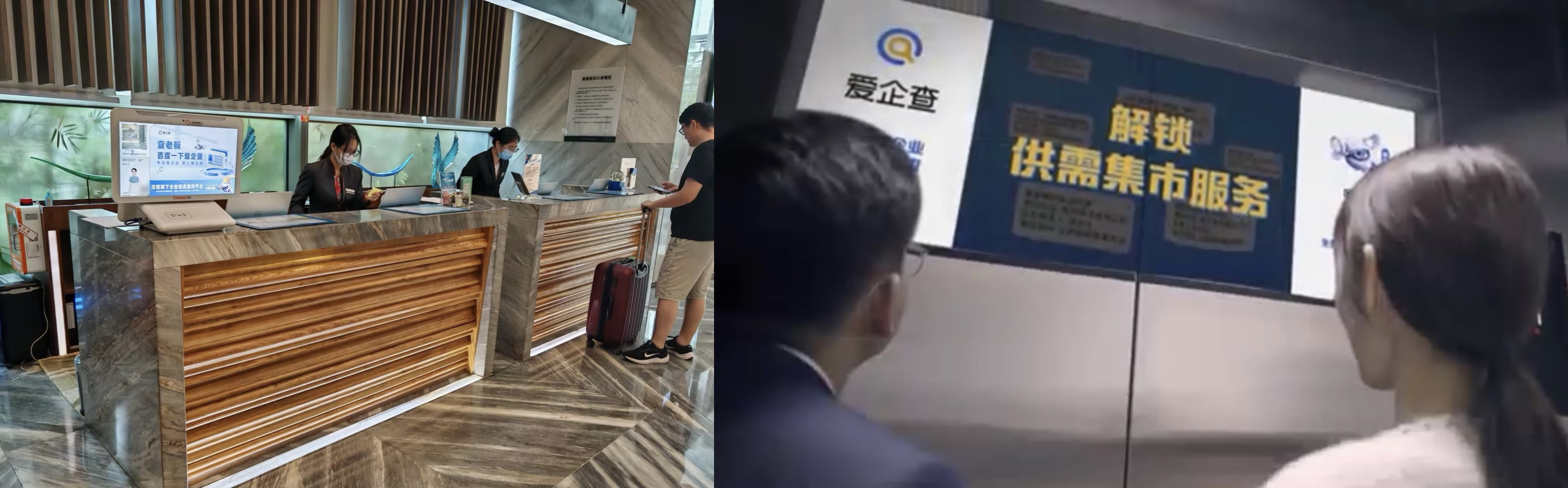 近期,愛企查在北京、深圳的核心商業(yè)區(qū)選擇商務(wù)酒店與寫字樓作為品牌宣傳的主陣地,在這些場所的高頻人流區(qū)域,如電梯和大堂,通過“靜態(tài)輪播+動態(tài)視頻”的多元化內(nèi)容巧妙展示其品牌內(nèi)容,成功吸引眾多職場精英的目光。通過此次投放,愛企查不僅向用戶傳遞出權(quán)威、專業(yè)的品牌形象,也讓用戶直觀感受到企業(yè)信息查詢的便捷性和高效性。