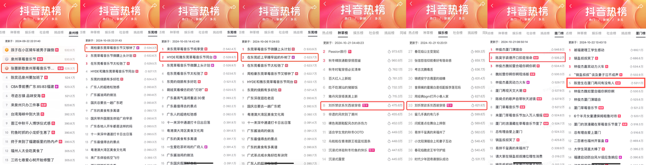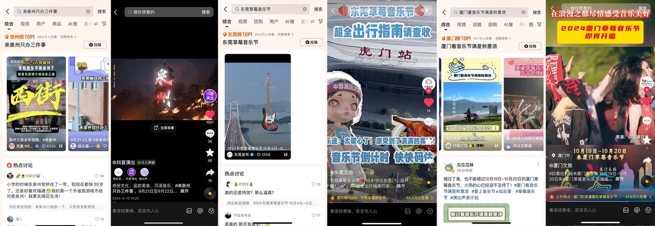 @海絲泉州文旅之聲 發(fā)布#來泉州只辦三件事 ,創(chuàng)意內(nèi)容登上泉州榜TOP1,以城市文化為抓手助力泉州草莓音樂節(jié)出圈;抖音演出攜手@東莞文旅 主推 #東莞草莓音樂節(jié) ,登上東莞榜TOP1,為樂迷誠意奉上超全出行指南;@廈門文旅 實時轉(zhuǎn)播演出當(dāng)天的舞臺精彩瞬間,將線下氛圍傳遞至線上,成功登上廈門榜TOP1。