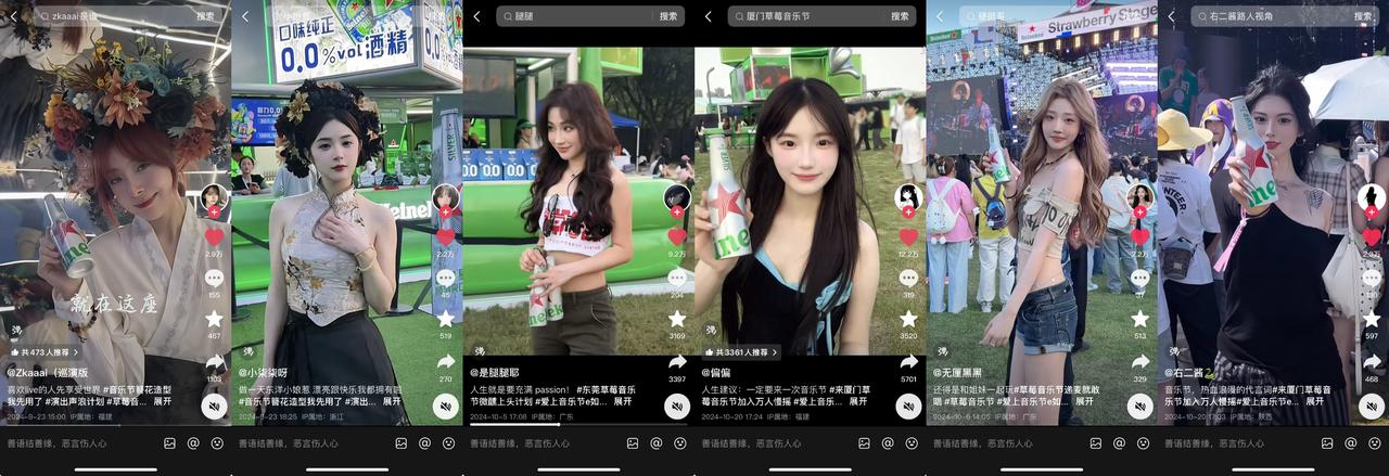 值得一提的是,在音樂節(jié)現(xiàn)場,喜力啤酒品牌展區(qū)吸引眾多樂迷前往打卡,成功為演出現(xiàn)場氛圍帶了更多趣味和活力。抖音演出借力平臺內(nèi)豐富的達人資源,聯(lián)動19+頭部熱門達人,花式打卡喜力啤酒品牌展區(qū),借助品牌創(chuàng)意打卡專區(qū)和草莓音樂節(jié)現(xiàn)場氛圍引發(fā)互動熱情。達人視頻亮點紛呈,品牌商業(yè)展位高效曝光,帶動演出活動頻頻出圈。