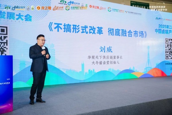 華聚天下供應(yīng)鏈董事長(zhǎng)、大牛醬鹵堂創(chuàng)始人劉威帶來主題分享《不搞形式改革 徹底融合市場(chǎng)》,提出"鹵味企業(yè)應(yīng)從供應(yīng)鏈、品牌運(yùn)營(yíng)、消費(fèi)場(chǎng)景三方面進(jìn)行深度融合"的創(chuàng)新理念。