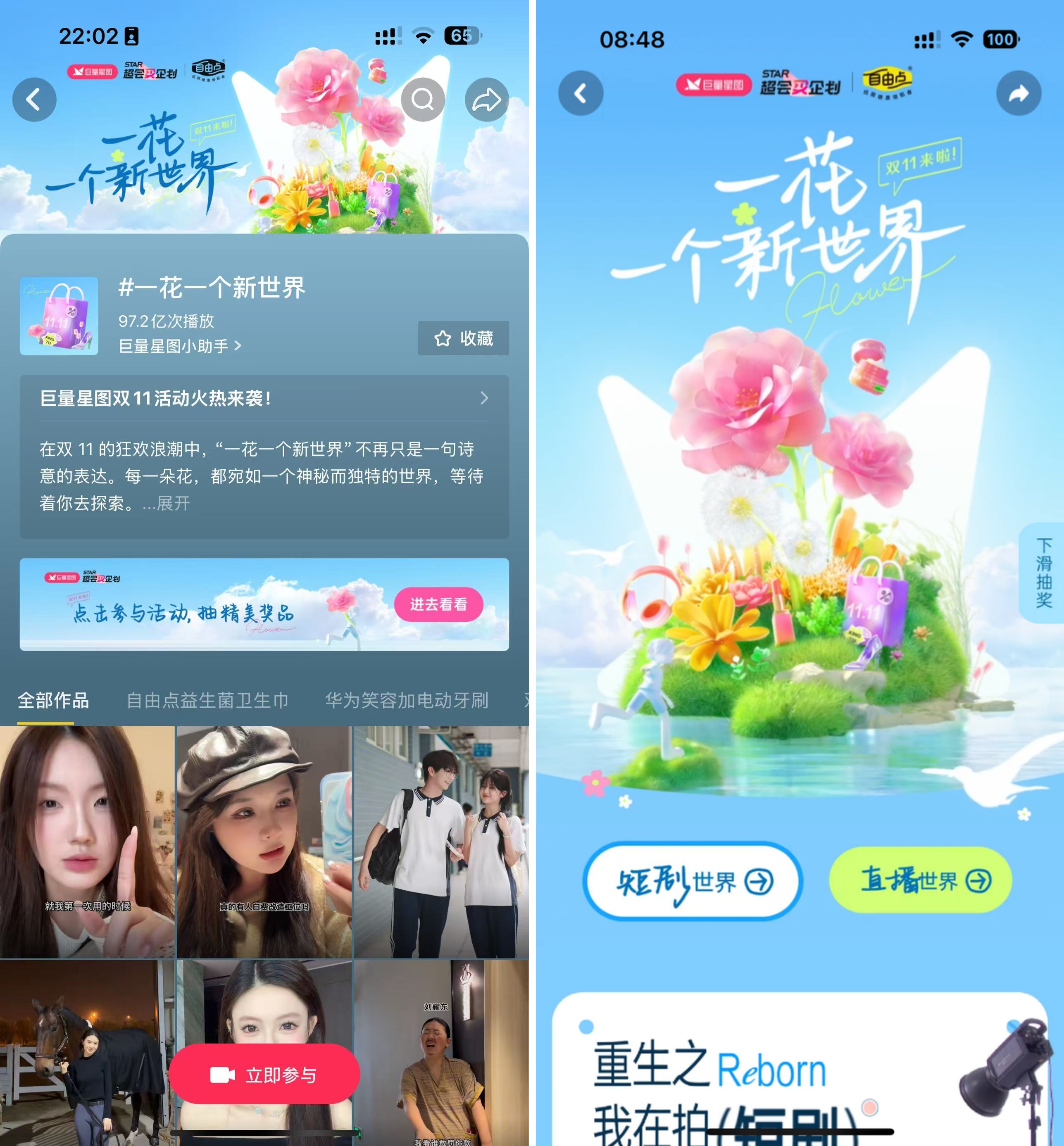 成功打造了主話題#一花一個(gè)新世界,實(shí)現(xiàn)90億+全網(wǎng)曝光量,5.5W+UGC參與,442家品牌聯(lián)動(dòng),1000+達(dá)人攜手,12.5%的流量激勵(lì)幅度,子話題 #雙11超會(huì)買 #奇趣時(shí)刻歡樂多 #短劇界的金花賞,掀起 7億+關(guān)注熱潮……