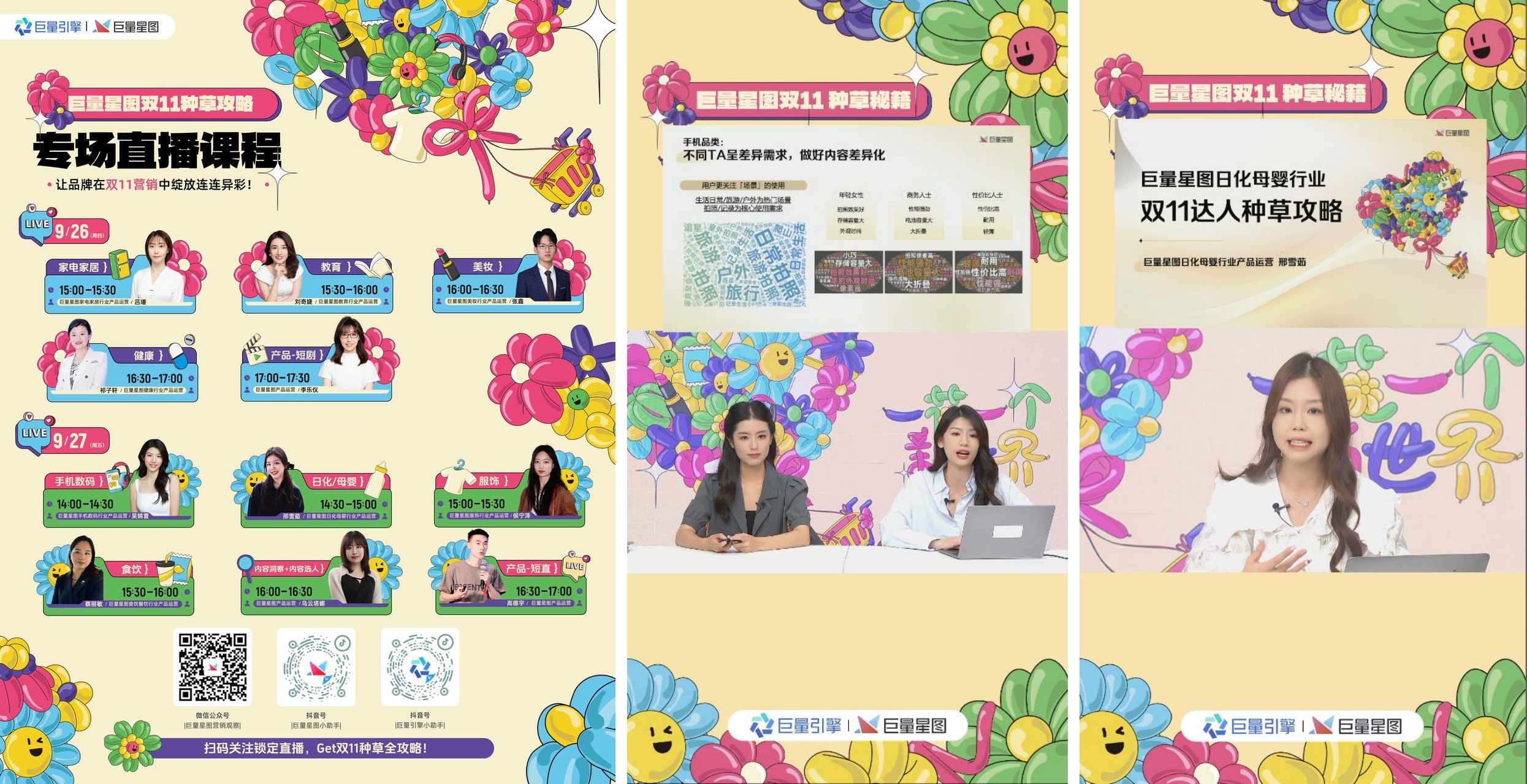 為了全方位營銷布局的順利落地,巨量星圖在活動(dòng)開始前發(fā)布了針對(duì)美妝、服飾、日化等9大行業(yè)的雙11趨勢(shì)報(bào)告,為品牌提供了寶貴的市場(chǎng)洞察,助力品牌把握大促靈感。還同步開啟“好內(nèi)容走花路”星圖系列直播課程,11位巨量星圖行業(yè)產(chǎn)品運(yùn)營專家通過分析消費(fèi)者需求和購買行為推出了針對(duì)性的種草策略。兩天時(shí)間收獲近42萬觀看量,其中視頻號(hào)觀看量達(dá)4.22萬,抖音端觀看量達(dá)37萬,互動(dòng)點(diǎn)贊量高達(dá)188萬。