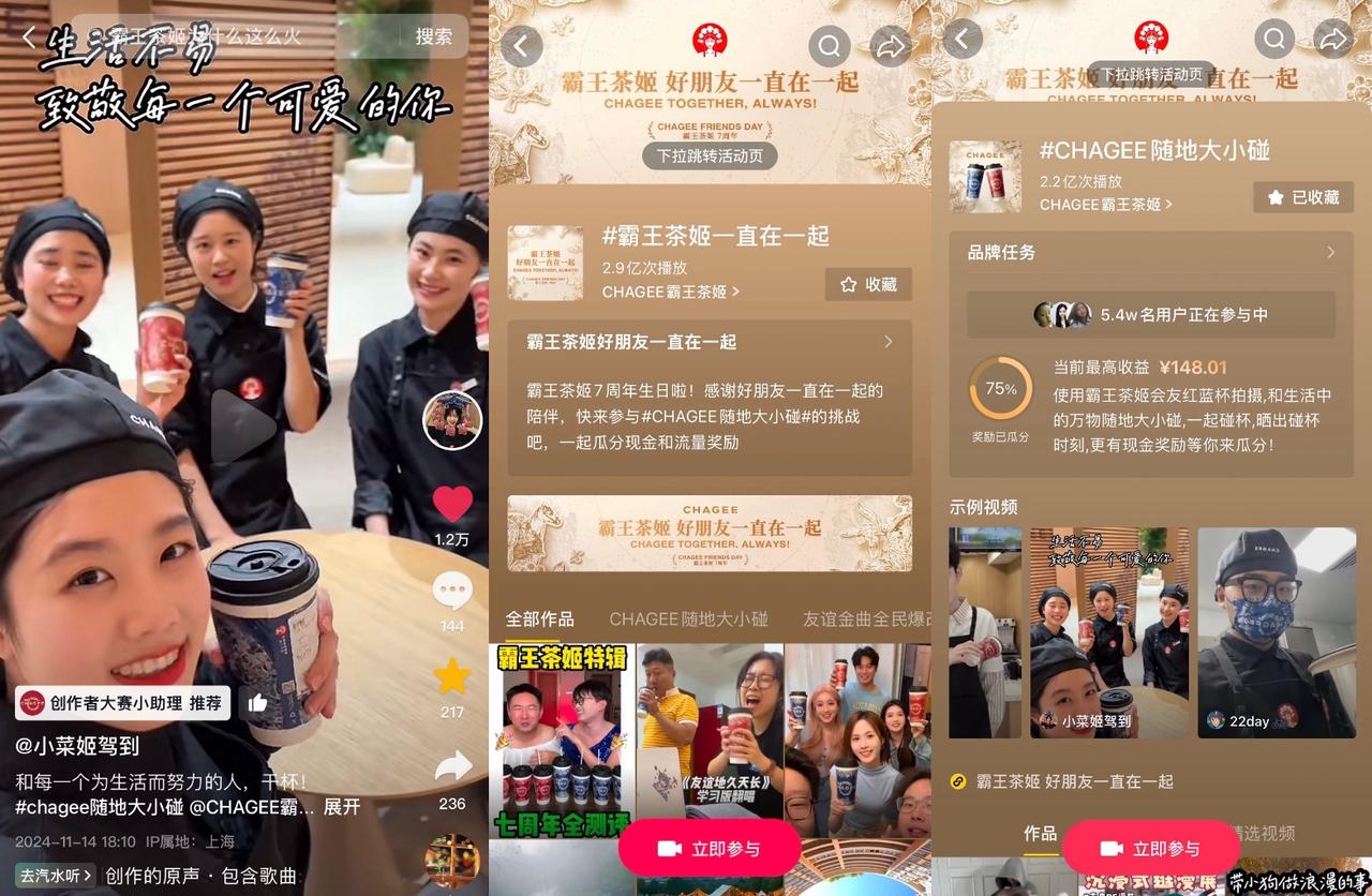 七載春秋的每一步成長,都離不開廣大茶友們的深情支持與堅定陪伴。品牌還攜手「抖音心動大牌日」在站內(nèi)通過 #霸王茶姬 一直在一起 周年慶主題話題,傳遞以茶會友的品牌理念,同時發(fā)起#CHAGEE隨地大小碰 、#友誼金曲全民爆改挑戰(zhàn) 兩個創(chuàng)意十足的「全民任務(wù)」,激發(fā)了無數(shù)創(chuàng)作者的靈感火花,掀起了一場全民參與的投稿熱潮。 無論是達(dá)人@小菜姬駕到 與環(huán)衛(wèi)工等各行業(yè)努力奮斗的人們,快樂干杯的溫馨畫面;還是博主@我殺豬了 一人分飾多角,時隔一年再度為茶姬演唱慶生的感人瞬間,都在評論區(qū)點燃了大家的討論熱情,助推話題熱度不斷攀升。