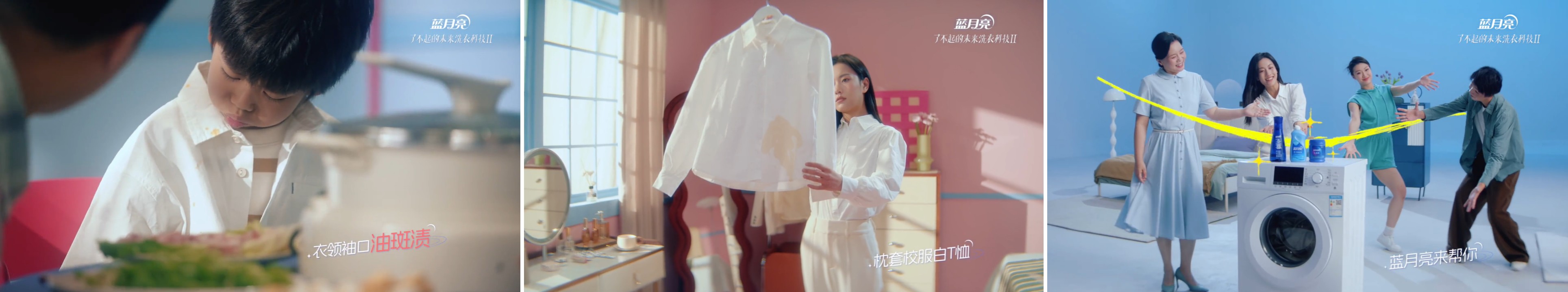 隨著魔性洗腦的 “嚕啦嚕啦咧 嚕啦嚕啦咧” 前奏響起,龔琳娜化身“首席體驗(yàn)官”,手持藍(lán)月亮系列產(chǎn)品穿梭于令人頭疼的生活場(chǎng)景中:吃火鍋時(shí)滴落的油漬、意外灑到白襯衣上的咖啡漬,以及如何設(shè)定不同衣物的機(jī)洗模式……面對(duì)這些棘手洗衣問(wèn)題,她以歡快的節(jié)奏唱出 “一涂二泡選時(shí)長(zhǎng) 至尊洗衣三錦囊”,將藍(lán)月亮的科學(xué)洗衣方法化作朗朗上口的旋律,讓洗衣科技隨著音樂(lè)節(jié)奏深植觀(guān)眾腦海。