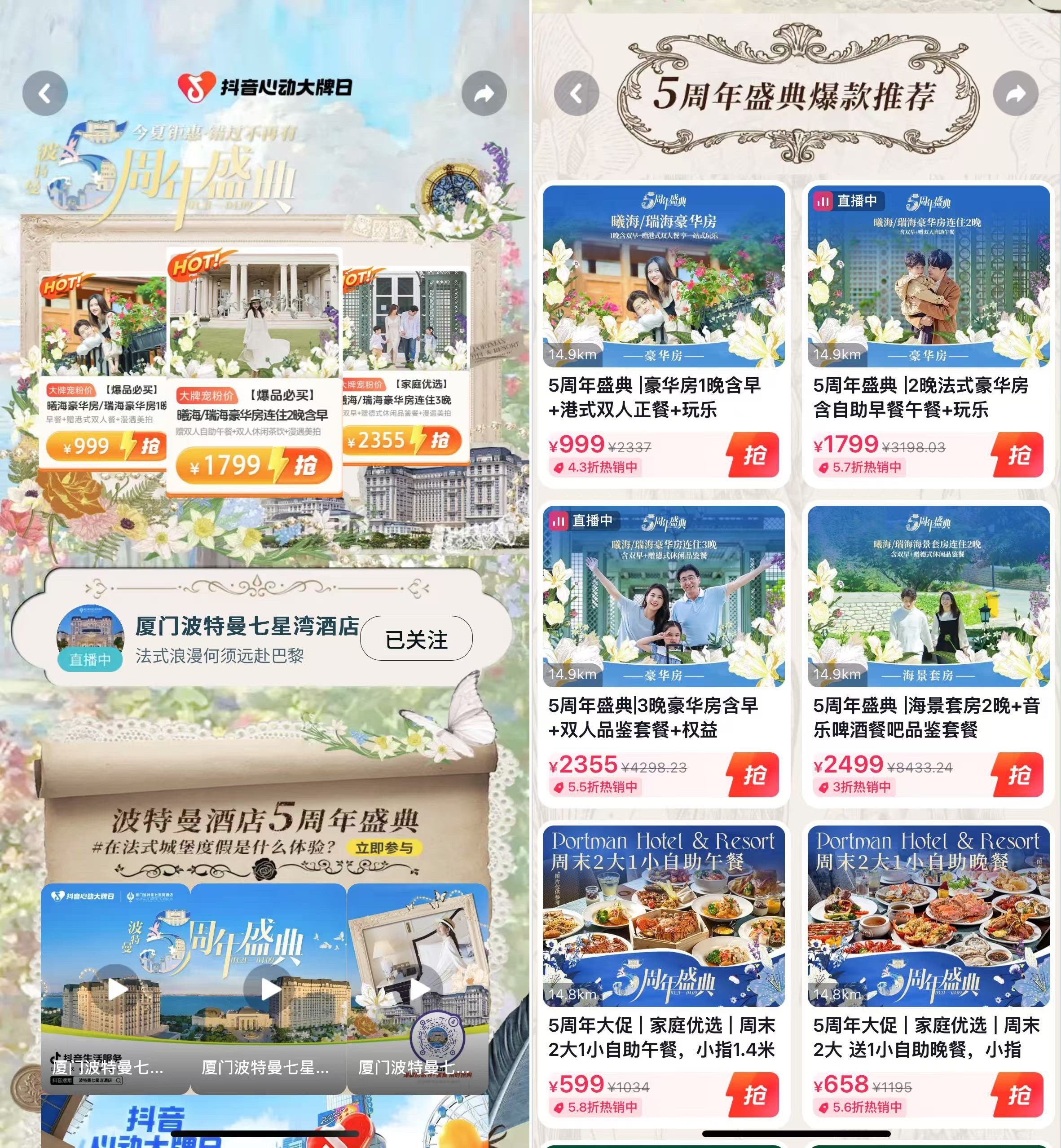 如何不斷拉高粉絲朋友們對(duì)5周年盛典的期待感與心動(dòng)值? 波特曼酒店品牌官方探索出了系列熱門玩法,不斷打響全網(wǎng)聲量。線上端提前打造了#在法式城堡度假是什么體驗(yàn)、#是廈門不是歐洲、#廈門波特曼酒店5周年盛典等多條熱點(diǎn)話題造勢(shì)預(yù)熱,成功引爆消費(fèi)者社交討論與自發(fā)式傳播;同時(shí)配合多系列短視頻內(nèi)容宣傳先行,開屏資源推出“法式心動(dòng)品牌專區(qū)”等多重玩法,提高用戶看后搜,不斷拓寬活動(dòng)信息的傳播渠道,讓更多人看到、了解并參與到這場盛大慶典中。 值得一提的是, 波特曼酒店聯(lián)動(dòng)「抖音心動(dòng)大牌日」搭建了多場“好看吸睛”直播間,深度聚焦“花草、法式和浪漫”三大視覺元素以營造超絕氛圍感,深化了用戶對(duì)異地度假旅游目的地的感知度。本次官方直播間更是突破GMV1074萬,多次登頂酒店直播全國榜一、創(chuàng)福建酒旅單場直播支付新高。 本次品牌新增餐飲直播間,通過探索餐飲直播新玩法,拉高整體GMV及后續(xù)核銷值。直播間不再拘泥美食場景,而是將“法式氛圍感”植入直播,將直播間搬到環(huán)東浪漫線,依海而播,將用戶眼光鎖定在直播間的海景浪漫中。 福利機(jī)制也是相當(dāng)“給力”:每場直播均為大家贈(zèng)送了高端餐飲套餐等豐厚加碼福袋驚喜隨機(jī)掉落,有效提升了用戶在直播間的停留時(shí)間和人氣。 為了持續(xù)點(diǎn)燃官方直播間熱度,波特曼酒店還巧妙聯(lián)動(dòng)站內(nèi)高人氣達(dá)人同步開播,通過增加頭部達(dá)人參與數(shù)量,既彰顯了品牌影響力,又借助明星達(dá)人的粉絲效應(yīng),提高了品牌曝光和粉絲關(guān)注度。 落實(shí)到線下層面,波特曼酒店結(jié)合大牌日心動(dòng)玩法,在酒店大堂、餐廳、客房等區(qū)域設(shè)置展架和互動(dòng)打卡裝置,吸引賓客眼球,同時(shí)在周邊商圈等人流密集區(qū)大屏滾動(dòng)“種草”用戶,多維度帶動(dòng)大促破圈傳播的同時(shí), 全方位滲透了“來廈門,就住波特曼”的心智概念。