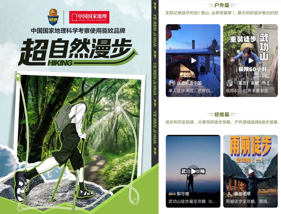 而抖音作為當(dāng)下視頻內(nèi)容最多元的平臺,也逐漸在徒步內(nèi)容上發(fā)力。最近,一個名為「野人計劃-超自然漫步」的活動集聚了眾多徒步愛好者的目光,這個由抖音、西瓜視頻聯(lián)合宣發(fā),「中國國家地理科學(xué)考察使用驅(qū)蚊品牌——超威」獨家冠名舉辦的徒步主題活動,活動總曝光38億+,抖音話題超4億,抖音平臺利用徒步場景,將戶外場景與夏季驅(qū)蚊痛點結(jié)合的營銷屬性發(fā)揮到極致。