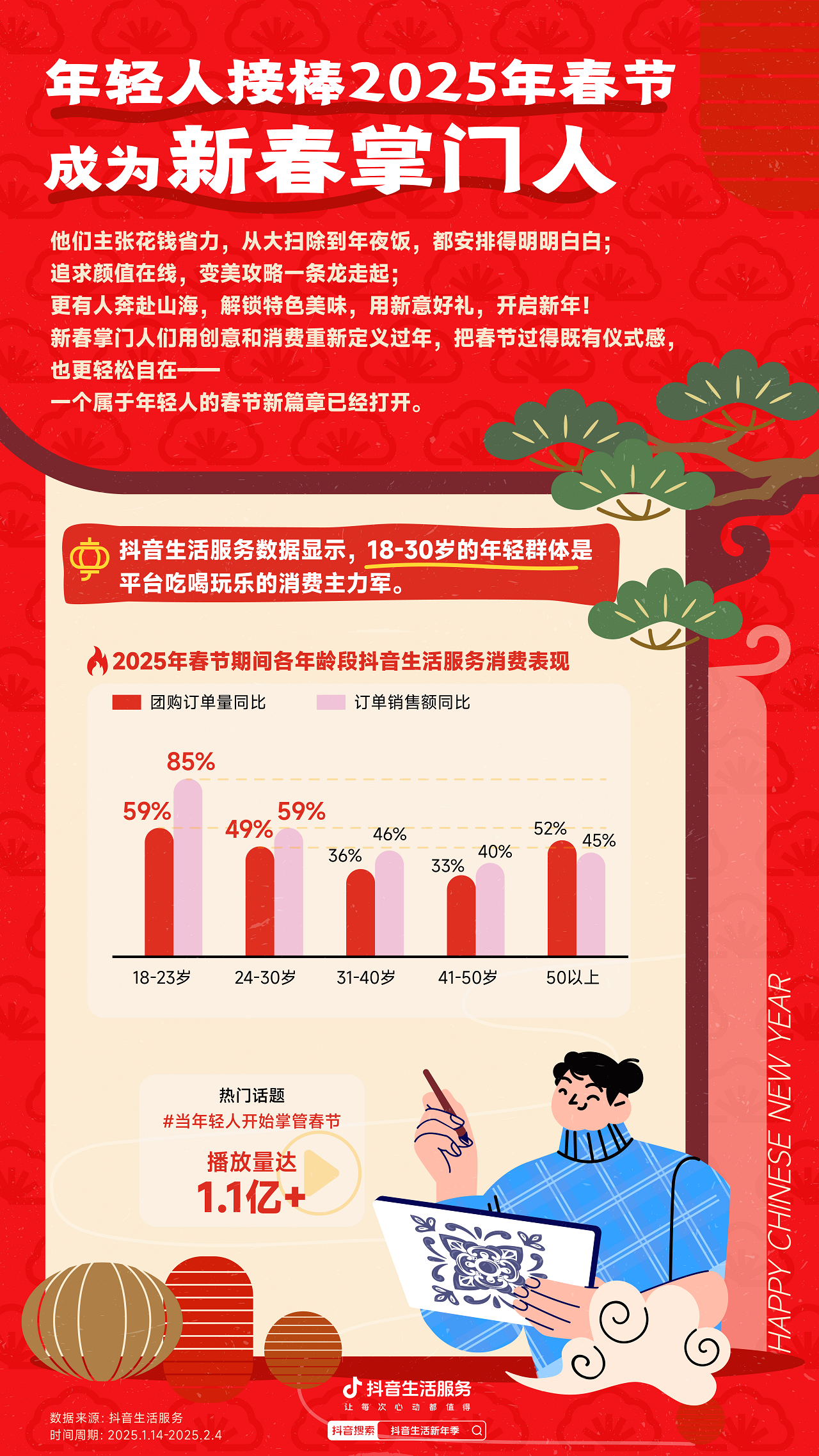 在此背景下,抖音生活服務(wù)聯(lián)合第一財(cái)經(jīng)商業(yè)數(shù)據(jù)中心(CBNData)發(fā)布《2025春節(jié)消費(fèi)數(shù)據(jù)報(bào)告——年輕人接棒新春掌門人》,通過(guò)數(shù)據(jù)還原春節(jié)期間人們?cè)诔院韧鏄?lè)和各項(xiàng)籌備事宜上的消費(fèi)圖景。我們發(fā)現(xiàn),2025年春節(jié)期間,18-30歲的年輕人已經(jīng)是抖音生活服務(wù)平臺(tái)吃喝玩樂(lè)的消費(fèi)主力軍,而在年輕一代的積極參與下,蛇年春節(jié)正呈現(xiàn)出獨(dú)特的儀式感、自由感和松弛感,年味也因此變得更多元。