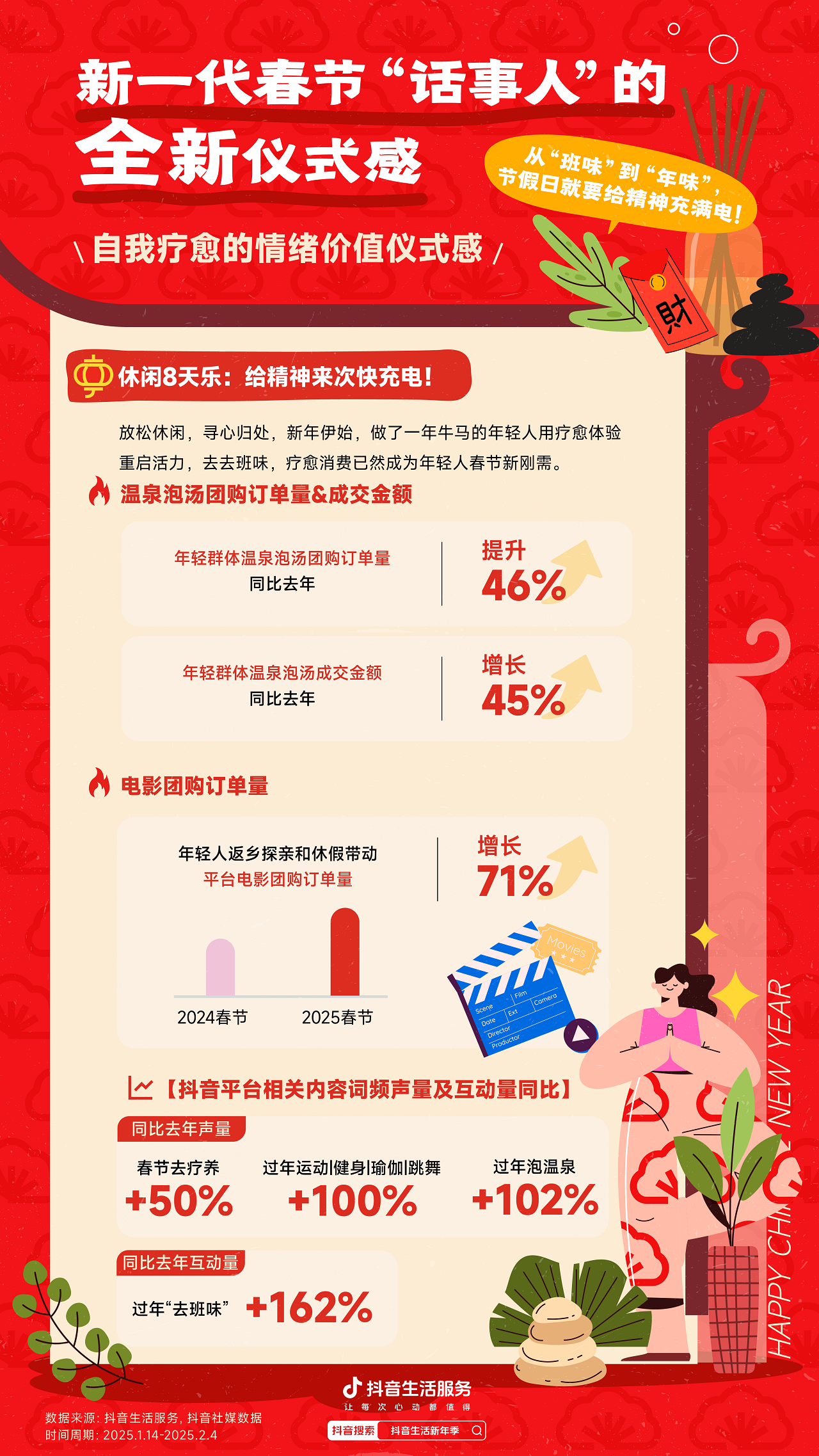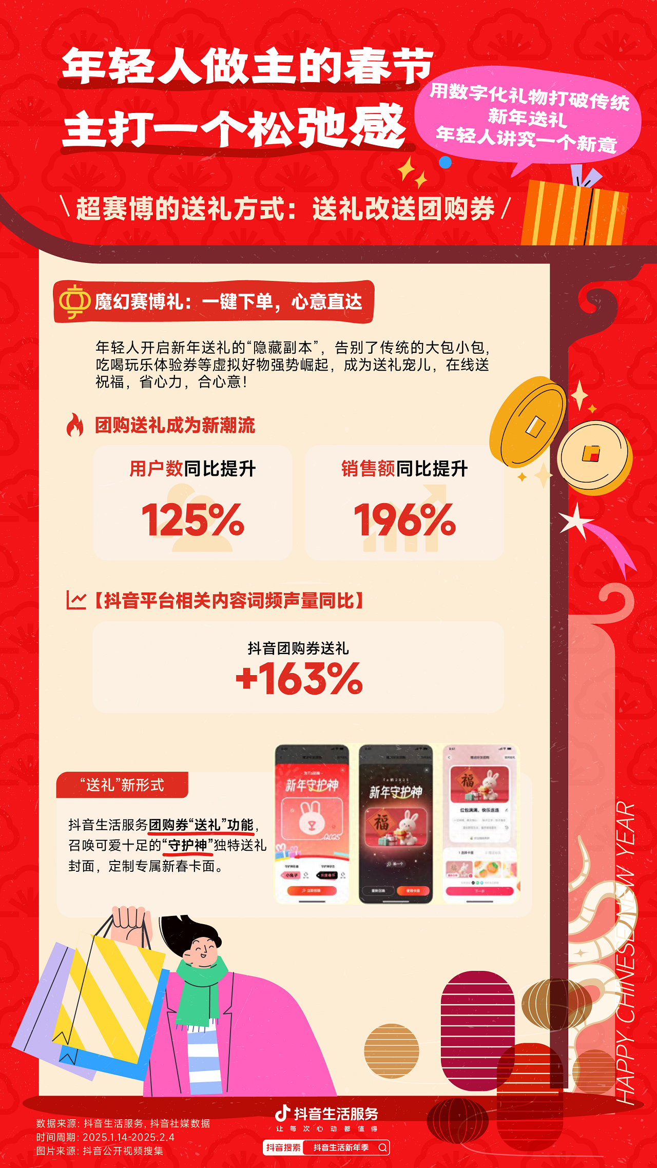 年輕人過(guò)春節(jié)主打松弛感年輕人掌管的蛇年春節(jié),松弛感遍布春節(jié)籌備、拜年送禮等各個(gè)環(huán)節(jié)。他們不再執(zhí)拗于復(fù)制和跟隨傳統(tǒng)習(xí)俗,反而更關(guān)心父母親友需要的是什么,春節(jié)怎樣過(guò)才能省時(shí)省力,把時(shí)間留給更重要的事情。 賽博送禮反套路,春節(jié)改送團(tuán)購(gòu)券抖音生活服務(wù)數(shù)據(jù)顯示,2025年春節(jié),新春團(tuán)購(gòu)送禮的用戶數(shù)和銷售額同比提升了125%和196%。除了飲料、煙酒、零食、水果等傳統(tǒng)春節(jié)送禮標(biāo)配,年輕人開始更多關(guān)注團(tuán)購(gòu)券等“新型年禮”。 今年春節(jié),我們發(fā)現(xiàn)在傳統(tǒng)年禮之外,抖音生活服務(wù)平臺(tái)推出了團(tuán)購(gòu)券“送禮”功能,用戶能召喚可愛(ài)十足的“守護(hù)神”獨(dú)特送禮封面,定制專屬新春卡面,這吸引更多年輕人玩起了線上送禮。 團(tuán)購(gòu)券火熱的邏輯在于,對(duì)比傳統(tǒng)送禮套餐,年輕人更偏好快捷方便有新意的送禮方式。吃喝玩樂(lè)體驗(yàn)券、團(tuán)購(gòu)券這樣的數(shù)字化禮物,不僅有新意,也很實(shí)用,親友可以自主消費(fèi)和體驗(yàn),還能與家人共享,線上送禮也更省心省力。