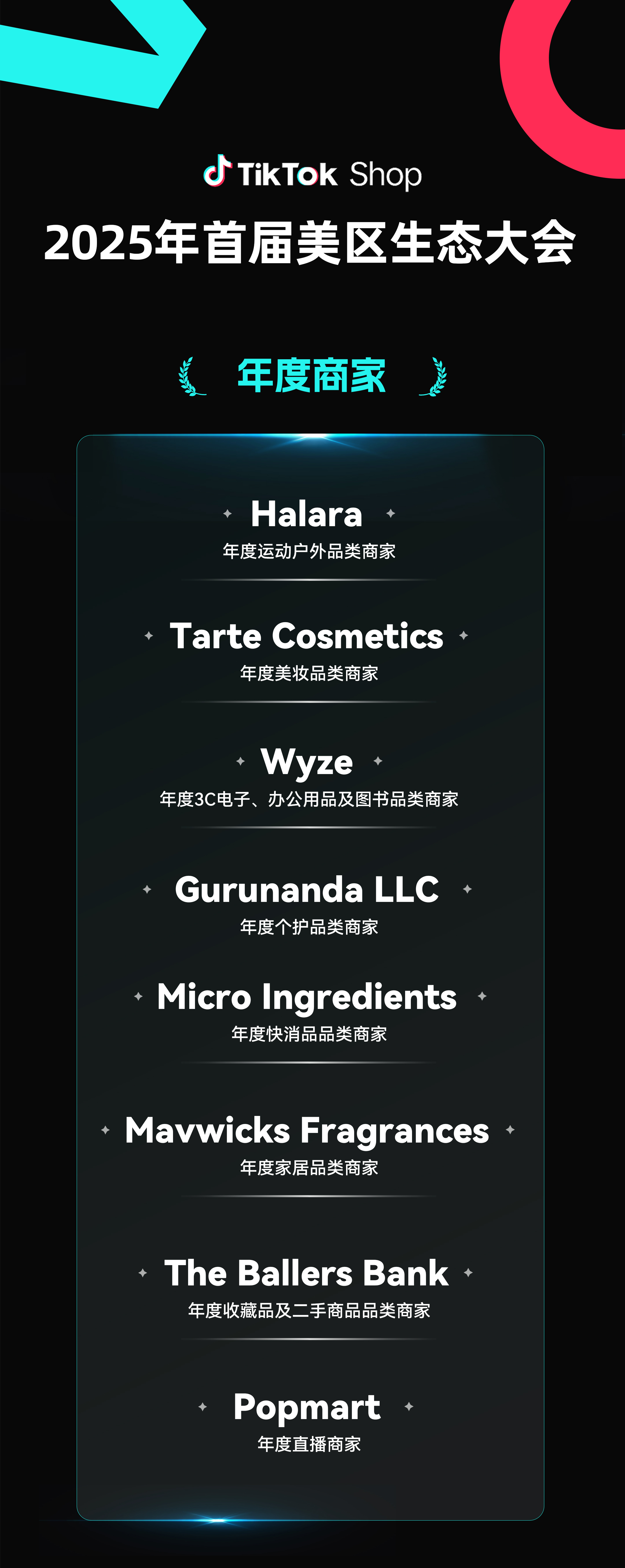 此外,此次生態(tài)大會(huì),表彰了一批優(yōu)秀商家,獎(jiǎng)項(xiàng)涵蓋年度商家,新星商家,營(yíng)銷大促商家三個(gè)類別。其中Halara、Popmart、ChicMe、Euhomy、TYMO、OQQ、Pacsun、Tarte Cosmetics、Wyze、Crocs等商家獲得了重磅獎(jiǎng)項(xiàng)。