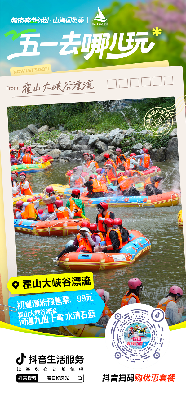 霍山大峽谷漂流 作為漂流出游熱門目的地之一的4A級(jí)景區(qū),以驚險(xiǎn)刺激著稱,全程約8公里,2-3小時(shí)峽谷狂飆,激流險(xiǎn)灘與峽谷森林相映成趣,夏日清涼體驗(yàn)與沿途自然風(fēng)光令人腎上腺素飆升!