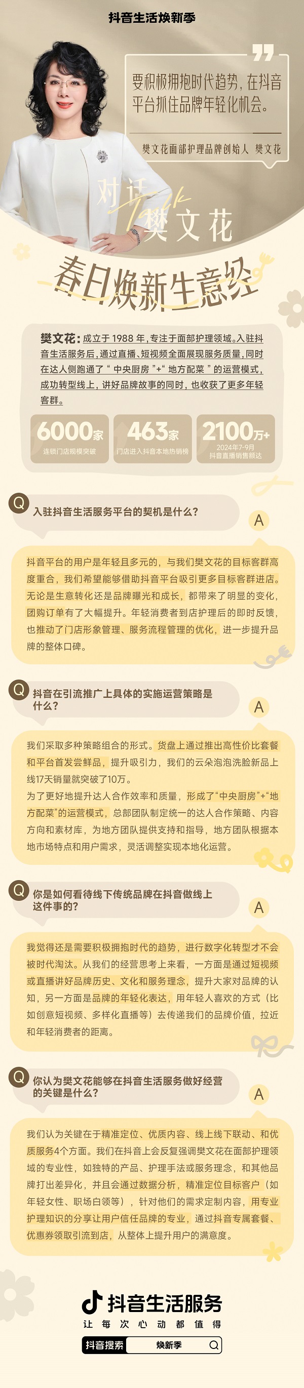 樊文花在抖音寫下的,不僅是通過線上經(jīng)營煥活線下生意的故事,更是 一個成立37年的品牌,如何主動擁抱年輕人群、擁抱運營效率,邁向年輕化和規(guī)模化的故事。樊文花希望幫助10000名女性創(chuàng)業(yè),50000名女性就業(yè),迎接一個又一個春天。