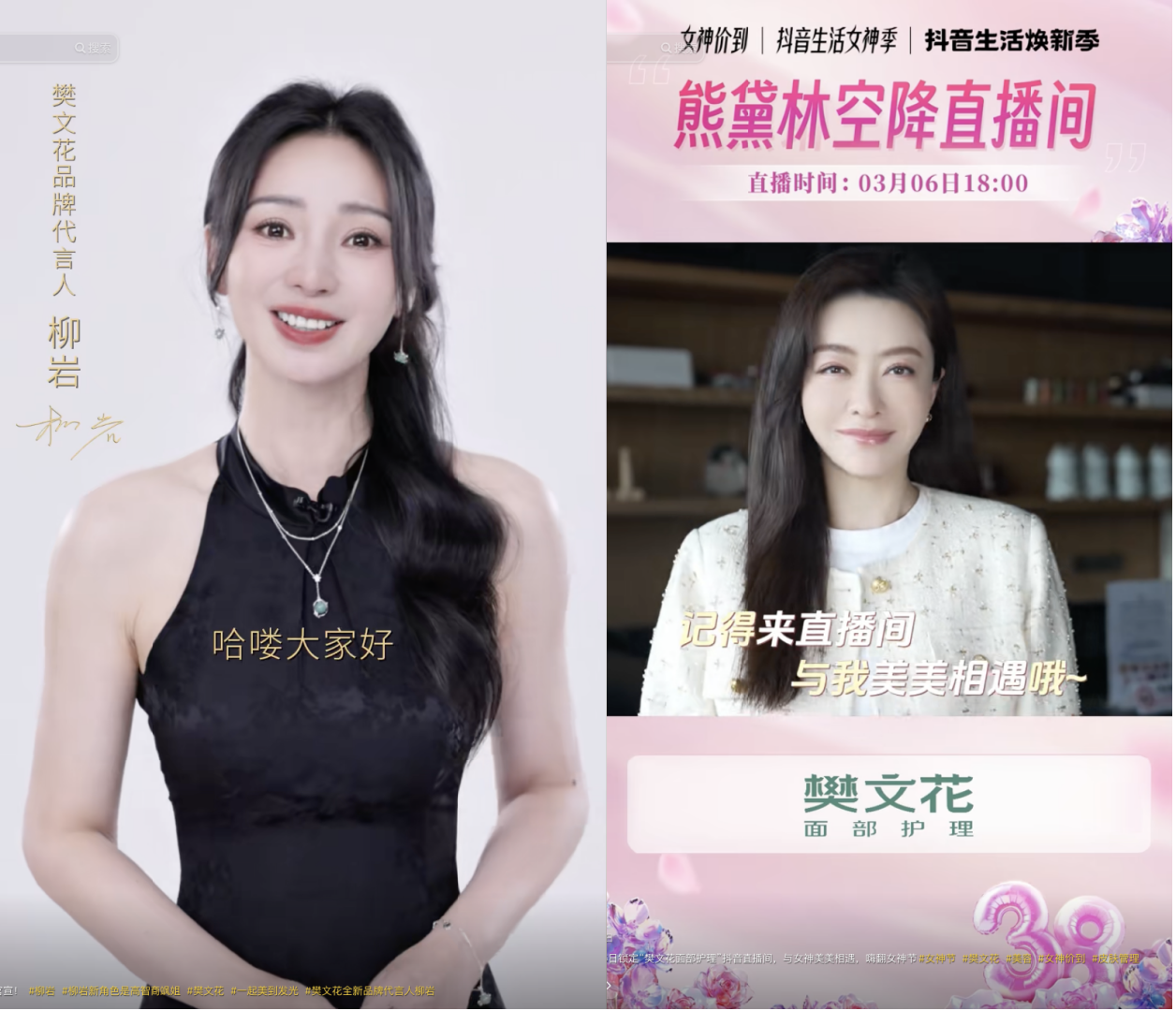 專注線下生意的那些年,年輕女性和樊文花仿佛隔了一層紗:她們更傾向于購買護膚品、自己動手,不習慣到店享受服務,對樊文花缺少了解。 而抖音70%以上用戶是樊文花的潛在新客,其中18-35歲的年輕女性占比超85%。 樊文花想借進駐抖音的契機,拉近與年輕女性的距離,將她們轉(zhuǎn)化為新增會員和忠實粉絲。樊文花首先用興趣撬動年輕女性的注意力。明星和護膚兩大話題討論熱度長期居高,樊文花順勢借力,在三八婦女節(jié)、母親節(jié)等女性向節(jié)日節(jié)點,聯(lián)動多位明星藝人,分享護膚經(jīng)驗,有效破圈,拉動年輕女性關(guān)注, 助力品牌多次登上全國麗人榜榜首。今年「抖音生活煥新季」,創(chuàng)始人樊文花更攜手熊黛林現(xiàn)身直播間,同年輕女性走心分享,最高同時在線近3萬人, 收獲超2000萬全網(wǎng)總曝光。