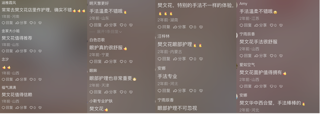 2022年4月,樊文花面部護理進駐抖音生活服務,開通官方抖音號,更新膚質(zhì)類型分析、提拉緊致手法等短視頻,嘗試上架清潔補水和特色抗皺/修護/嫩膚/清顏團購,吸引網(wǎng)友主動“匯報”自己的面部狀態(tài),詢問屬于哪種膚質(zhì)。哪怕沒有線下路過樊文花門店,但越來越多對美容保養(yǎng)感興趣的用戶開始記住了樊文花面部護理。