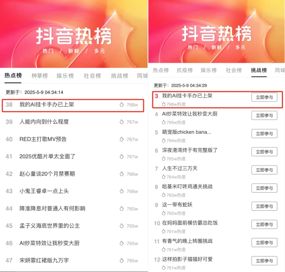 這種“眾星捧月”的推廣策略,迅速將#我的AI掛卡手辦已上架 話題推向高潮。截至5月15日20點(diǎn),該話題播放量已達(dá)3176.4萬,投稿量更是高達(dá)9938個(gè),一度登陸抖音總榜TOP38、挑戰(zhàn)榜TOP3。