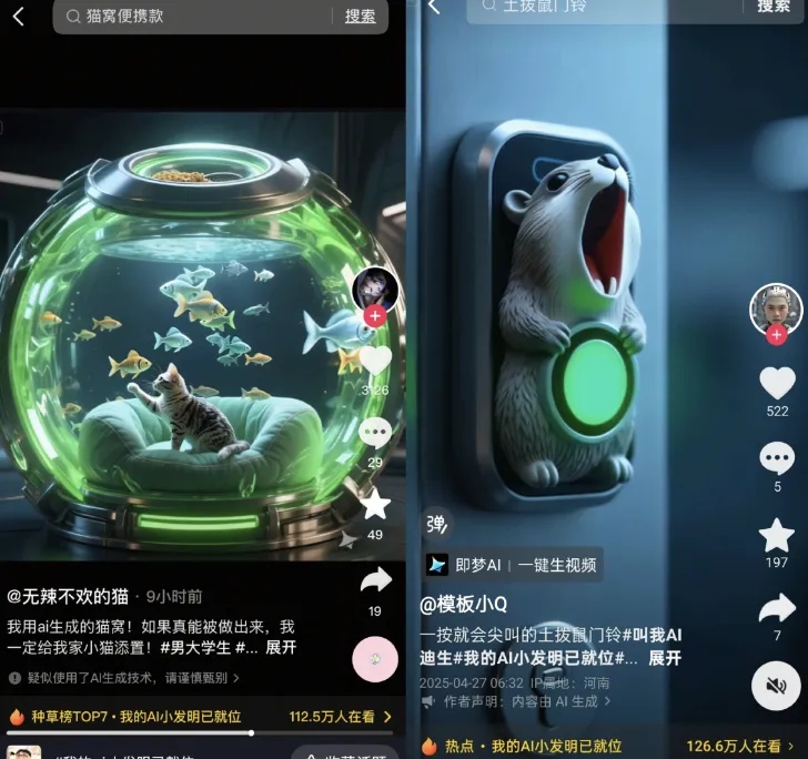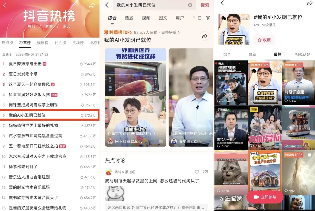 用戶們熱情高漲,紛紛曬出自己的AI作品,截止發(fā)稿前,#我的AI小發(fā)明已就位 話題播放量已超5800萬,投稿量超過1萬。
