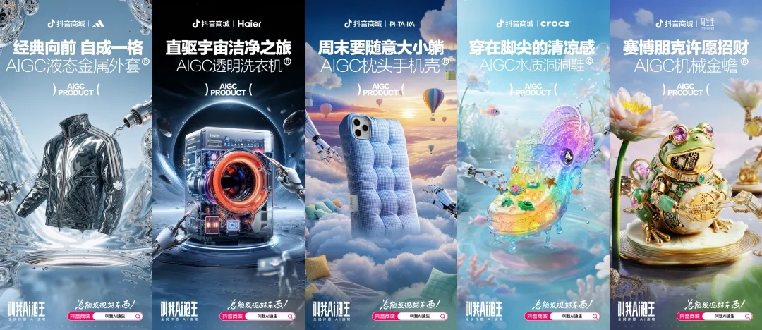 活動(dòng)中,抖音電商發(fā)起了票選“超級(jí)腦洞”未來好物的環(huán)節(jié),并將其中優(yōu)秀的用戶AI創(chuàng)意,與Adidas、Crocs、Casetify、Stanley、Casio、周大福、芝華士、海爾、三星、泡泡瑪特等十大知名品牌進(jìn)行“虛擬聯(lián)名”,制作成精美的聯(lián)名海報(bào)進(jìn)行全網(wǎng)擴(kuò)散。