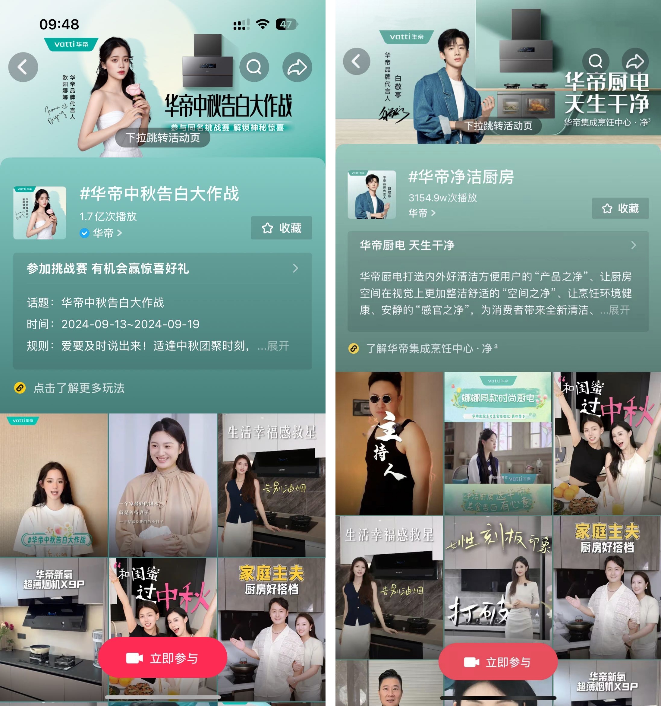 適逢中秋團(tuán)聚時刻,有愛就要及時說出來?;顒舆€特別定制H5,吸引一大波年輕人參與“華帝中秋告白大作戰(zhàn)”抖音挑戰(zhàn)賽,曬出那些藏于心底的愛與深情?;顒悠陂g,#華帝中秋告白大作戰(zhàn) #華帝凈潔廚房 等話題熱度不斷升溫,其中,#歐陽娜娜的告白神器 登上抖音熱點(diǎn)榜,挑戰(zhàn)賽發(fā)起的互動任務(wù)卷入大量用戶進(jìn)行二次互動,在持續(xù)發(fā)酵中引發(fā)傳播的漣漪效應(yīng)。