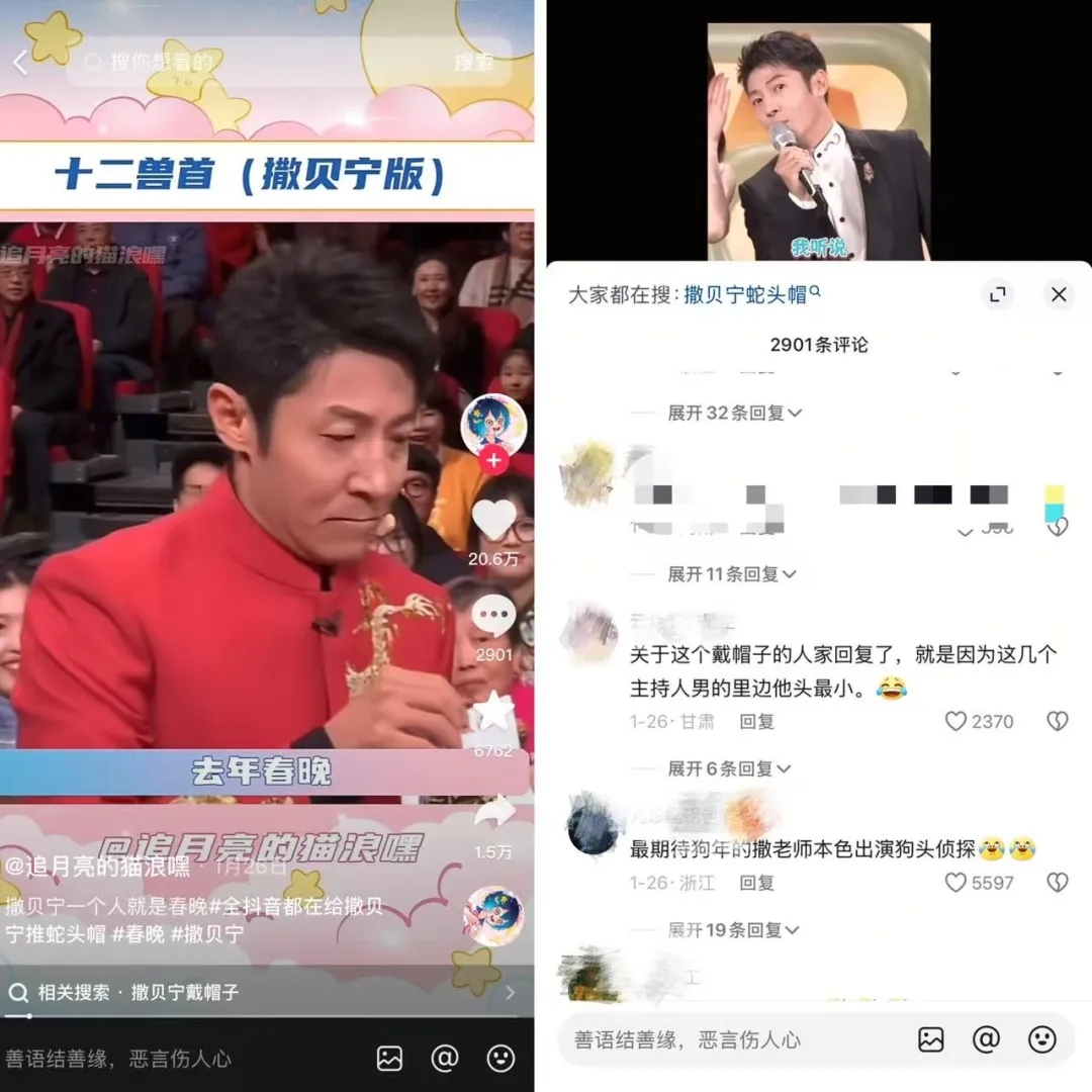 作為「春晚保留節(jié)目」,撒貝寧在春晚帶生肖帽已是觀眾心目中的經(jīng)典橋段,「今年小撒還會(huì)帶帽子嗎?」「狠狠期待撒老師的蛇頭帽」在春晚前夕就是用戶熱議的話題。