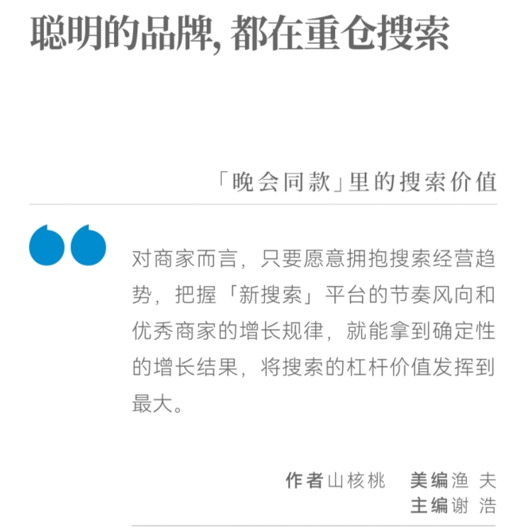 無論是新搜索,還是舊搜索,搜索經(jīng)營(yíng)之所以受到商家的集體關(guān)注,本質(zhì)上存量時(shí)代人們對(duì)挖掘用戶更多潛在需求、發(fā)現(xiàn)更多營(yíng)銷場(chǎng)景的迫切需求,搜索儼然已成為品牌商家們?cè)诰蚣?xì)算年代里高效觸達(dá)用戶、謀求長(zhǎng)期增長(zhǎng)的關(guān)鍵武器,它的價(jià)值也自然迎來了重估。