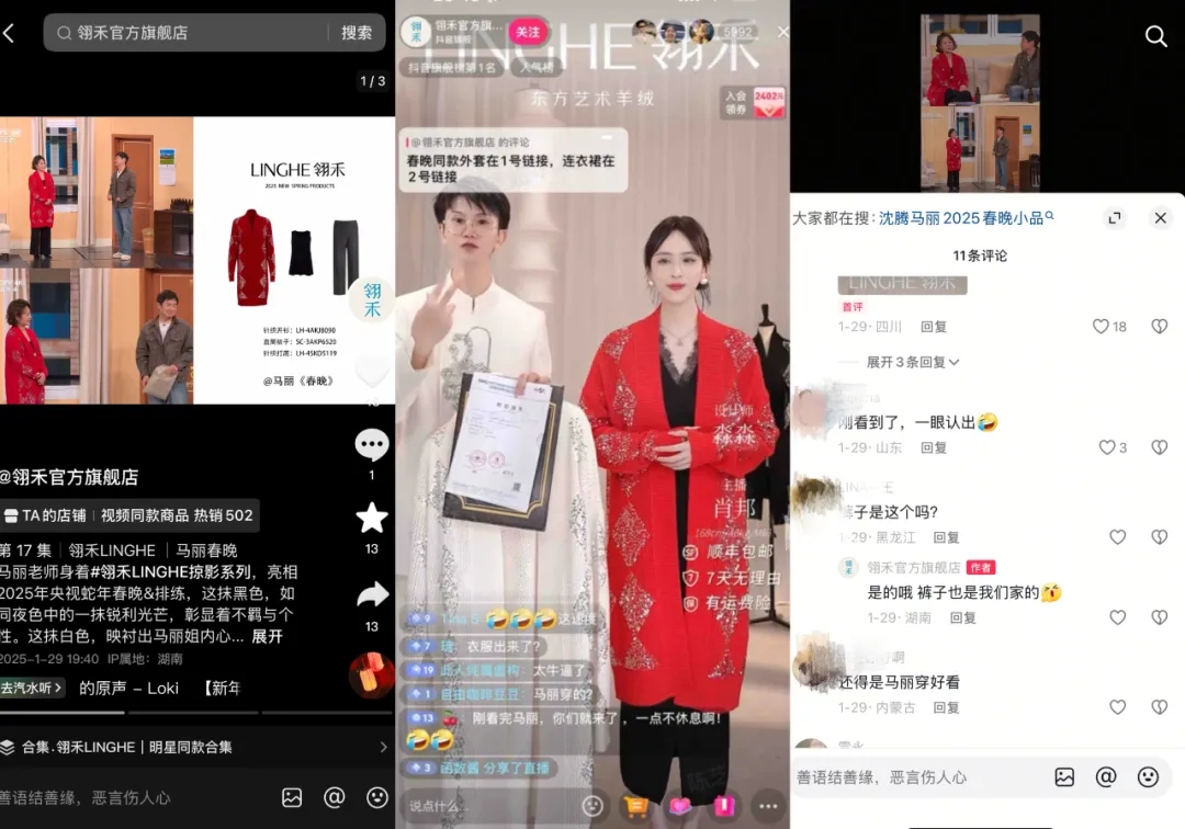 本土新中式服飾品牌翎禾 LINGHE 在去年龍年春晚就憑借「馬麗同款白色大衣」巧妙出圈,今年春晚也不例外。當(dāng)馬麗穿著翎禾 LINGHE 出現(xiàn)在小品《金龜婿》中時(shí),相關(guān)熱點(diǎn)#必須讓我媽擁有馬麗同款開衫 隨即被用戶搜上熱榜,品牌也快速做出反應(yīng),認(rèn)領(lǐng)熱點(diǎn)同款,連夜開啟直播,有不少網(wǎng)友就表示:“速度可以啊,馬麗同款,一眼就看出來了”。