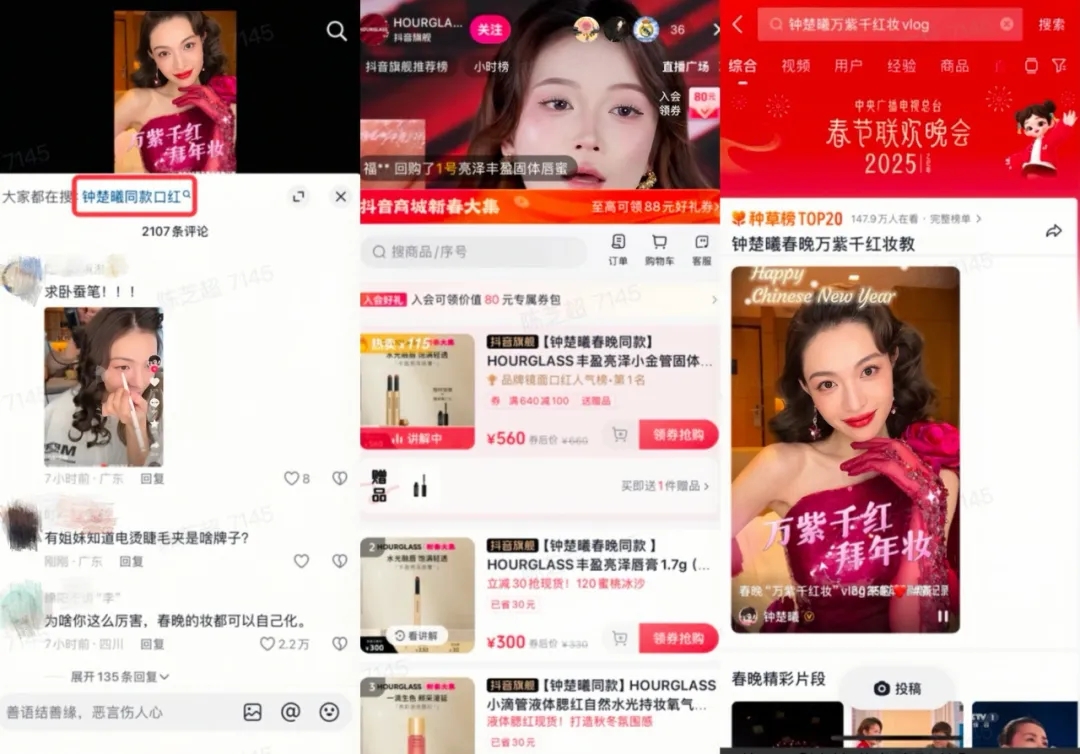 像是今年的蛇年春晚,在抖音電商,宋佳路透視頻中的羽絨服和褲子,鐘楚曦和倪妮的同款口紅,馬麗在小品《金龜婿》中的同款紅色毛衣全都成了搜索熱門......無論是服飾、美妝等春晚熱門品類,抑或是玩具等小眾品類,從頭部品牌到中小商家,一批「晚會(huì)同款」在抖音電商迎來生意爆發(fā)。