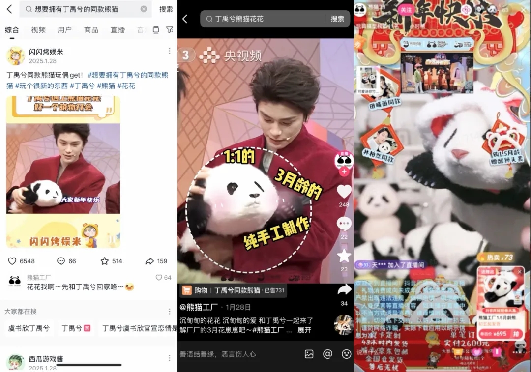 在今年春晚倒計(jì)時(shí)節(jié)目《春晚等著你》中,被丁禹兮抱著的熊貓玩偶就成了用戶關(guān)注的熱點(diǎn),@熊貓工廠 快速策劃#想要擁有丁禹兮的同款熊貓 話題,內(nèi)容團(tuán)隊(duì)在直播當(dāng)天集體實(shí)時(shí)錄屏,積累并發(fā)布了與丁禹兮同款熊貓相關(guān)的諸多優(yōu)質(zhì)短視頻內(nèi)容素材,如“小丁的第一支熊貓寶寶”“小丁的同款花花下臺(tái)后去了哪里呢?”“小丁一眼就愛上的熊貓是……”。