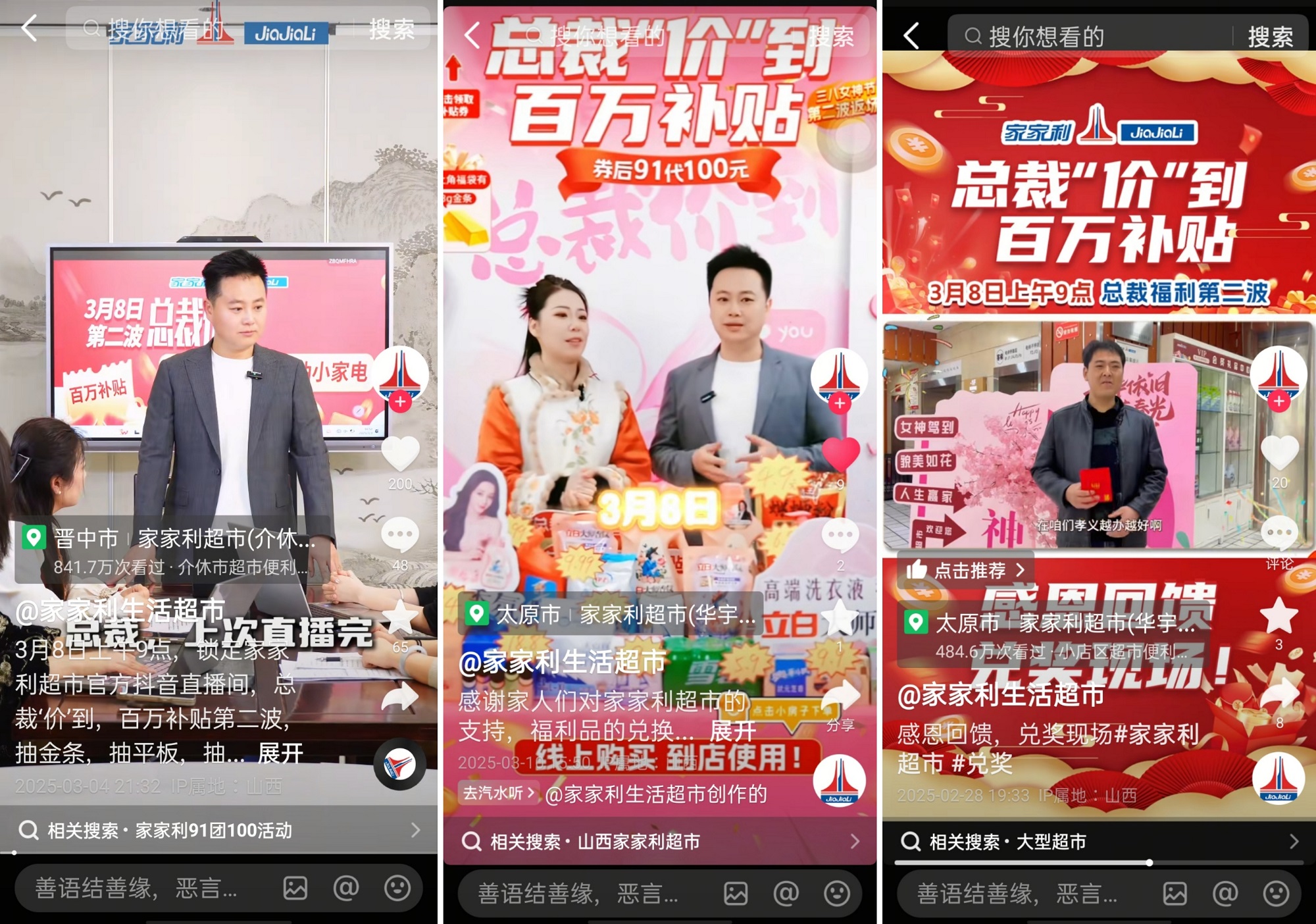 家家利超市總裁席寧分享道:“三八女神節(jié)抖音活動開檔當(dāng)天,直播間累計曝光人數(shù)220萬、最高同時上線人數(shù)5000+;直播間的流量經(jīng)由代金券和特價商品引流至門店轉(zhuǎn)化消費,最終帶動家洗類組同比增長48%”。
