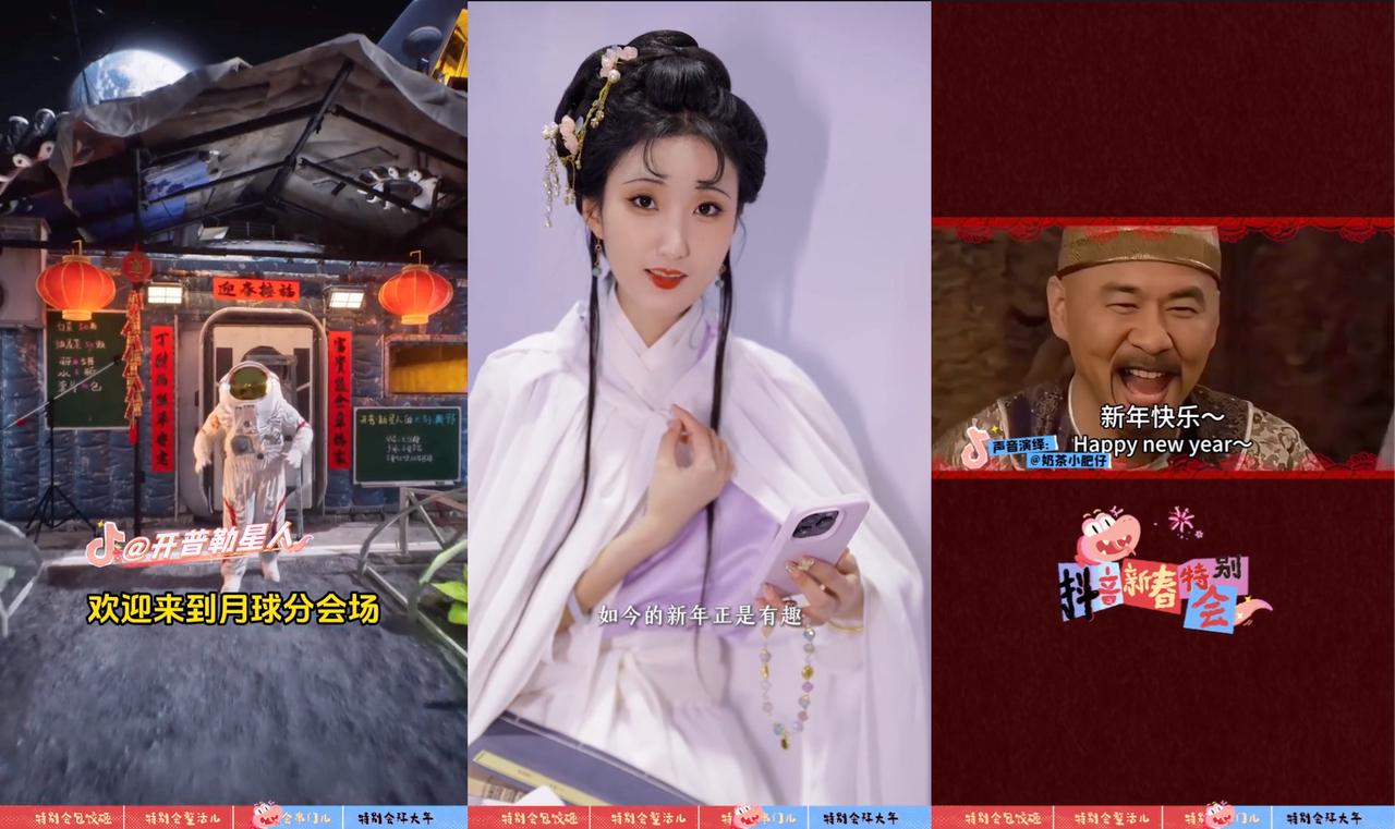 第三篇章特別會(huì)串門,給用戶展現(xiàn)出“在抖音里過年”的無限可能性,人們不僅可以在抖音記錄分享自己過年的場景,還能超越時(shí)間與空間,虛擬和現(xiàn)實(shí),在短劇里過年,在月球上、在“甄嬛宇宙”中過年,看到林黛玉穿越到現(xiàn)代來過年的場景。「抖音新春特別會(huì)」巧妙借鑒了春晚的內(nèi)容呈現(xiàn)形式,例如用分會(huì)場的模式,以全新的視角對(duì)大熱IP做新的詮釋,巧借化用,充滿創(chuàng)意。還有策劃大使作為主持人串場,創(chuàng)作者明星送祝福環(huán)節(jié),都是對(duì)春晚模式的致敬。