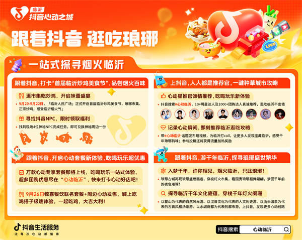 9月20日-10月9日,打開抖音app,搜索「心動臨沂」,和好友家人一起逛吃臨沂,見證文化與美食的雙向奔赴,感受一場穿越千年的夢幻奇旅!也歡迎廣大用戶帶上話題#心動臨沂 發(fā)布內(nèi)容,分享你眼中的特色臨沂,在抖音共繪臨沂城市名片! (編輯:楊艷)